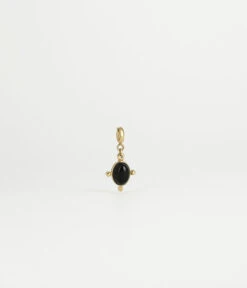 Ce charm en acier doré à l’or fin, se compose d’un mousqueton sur lequel est attaché un cabochon de pierre fine, orné de boules dorées.