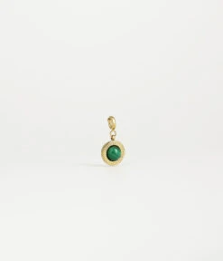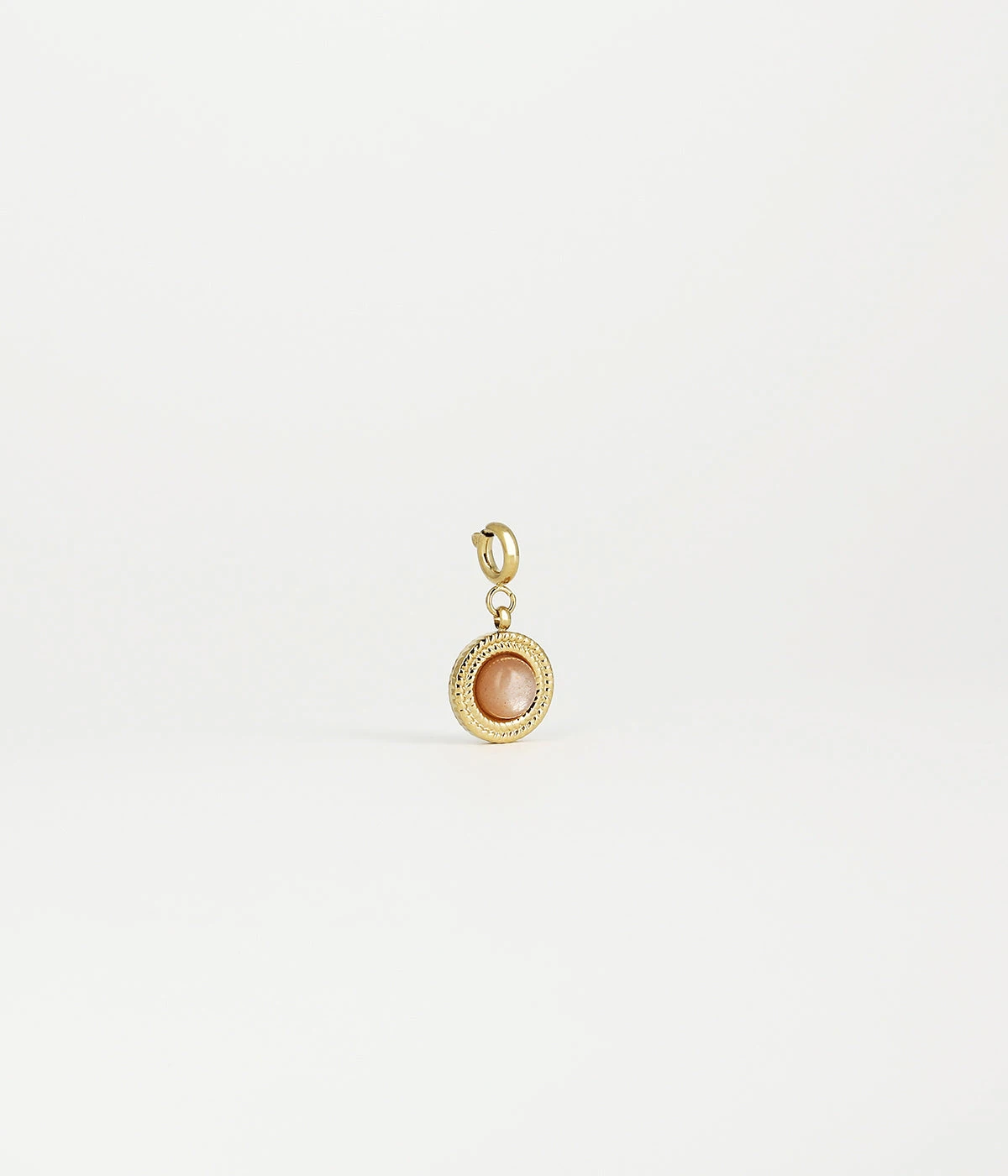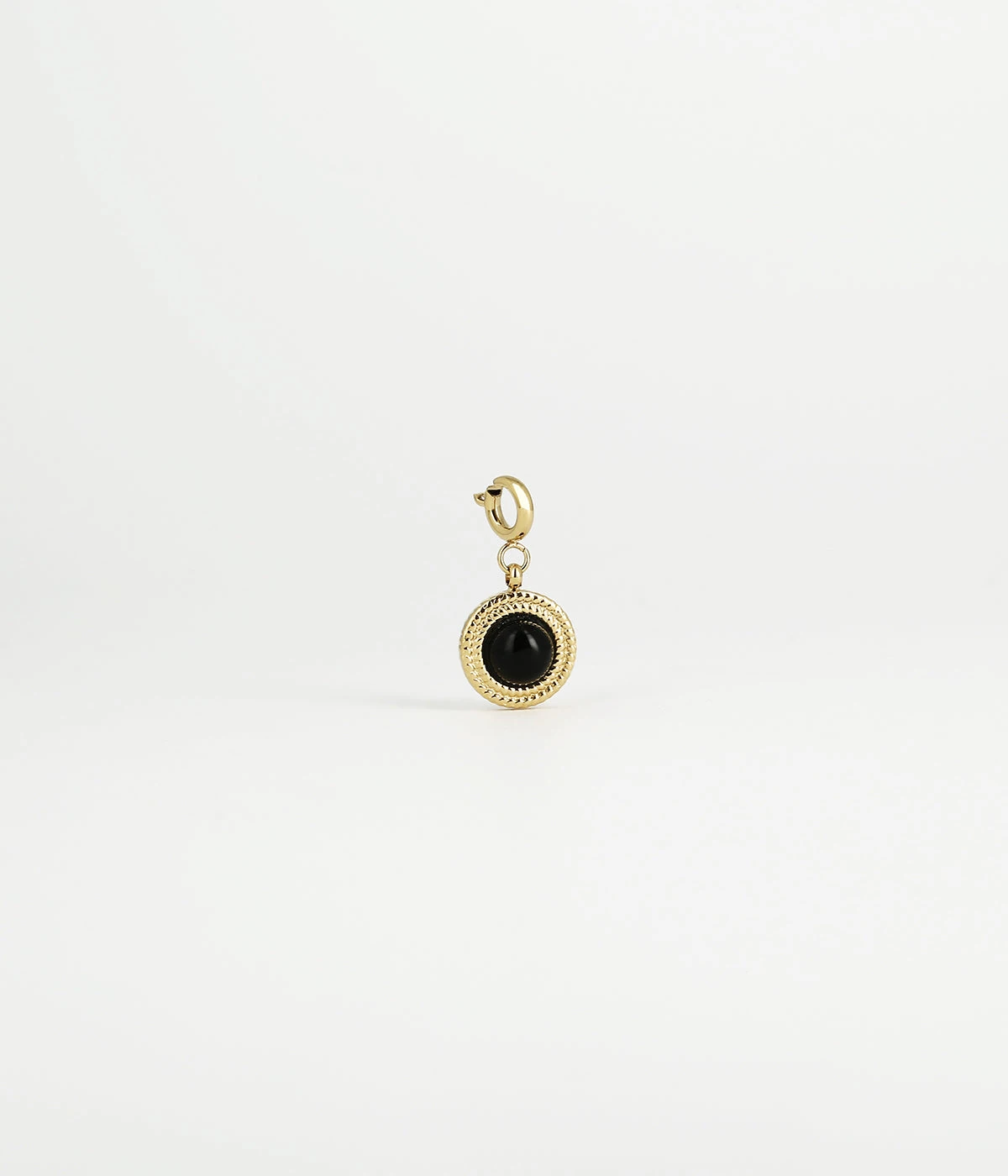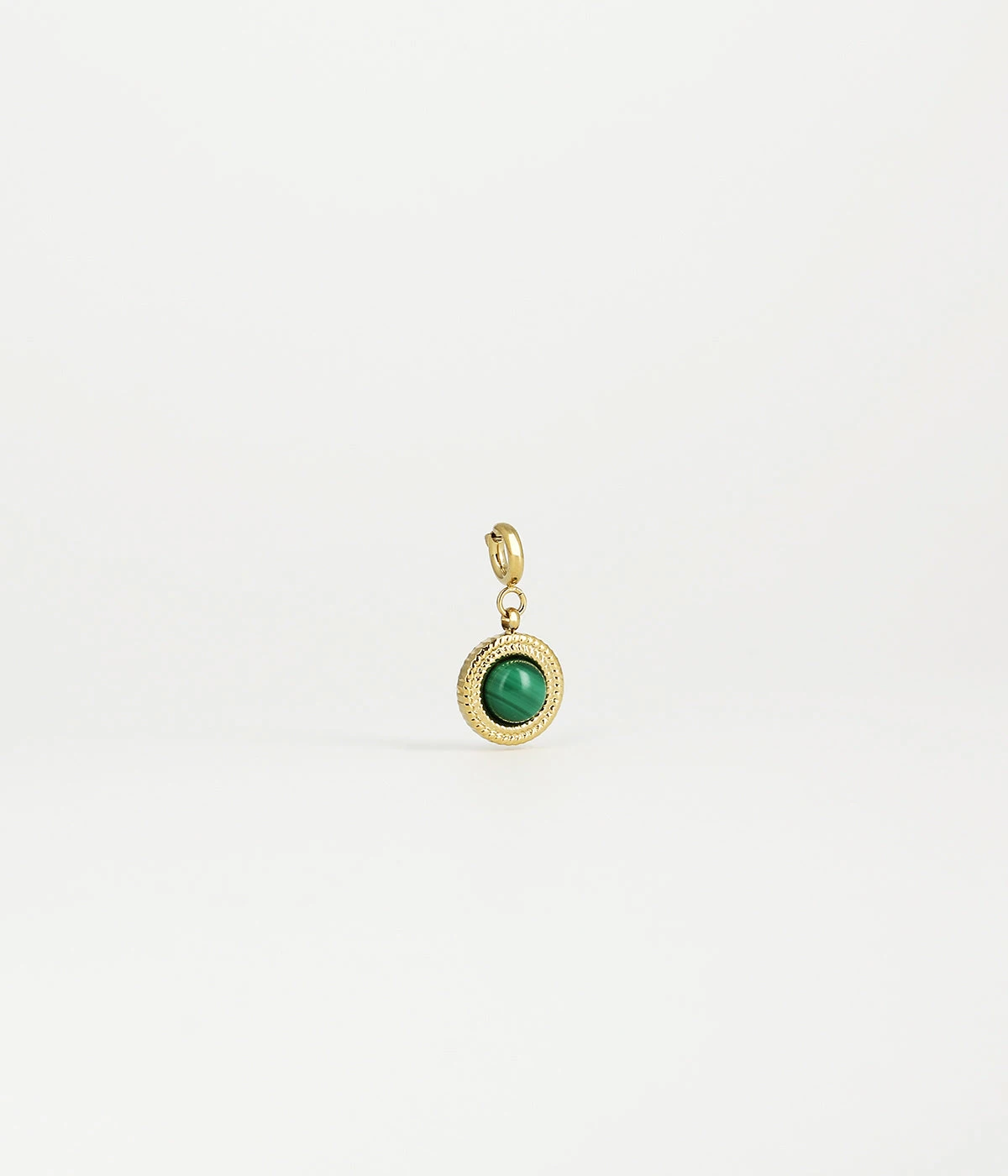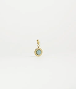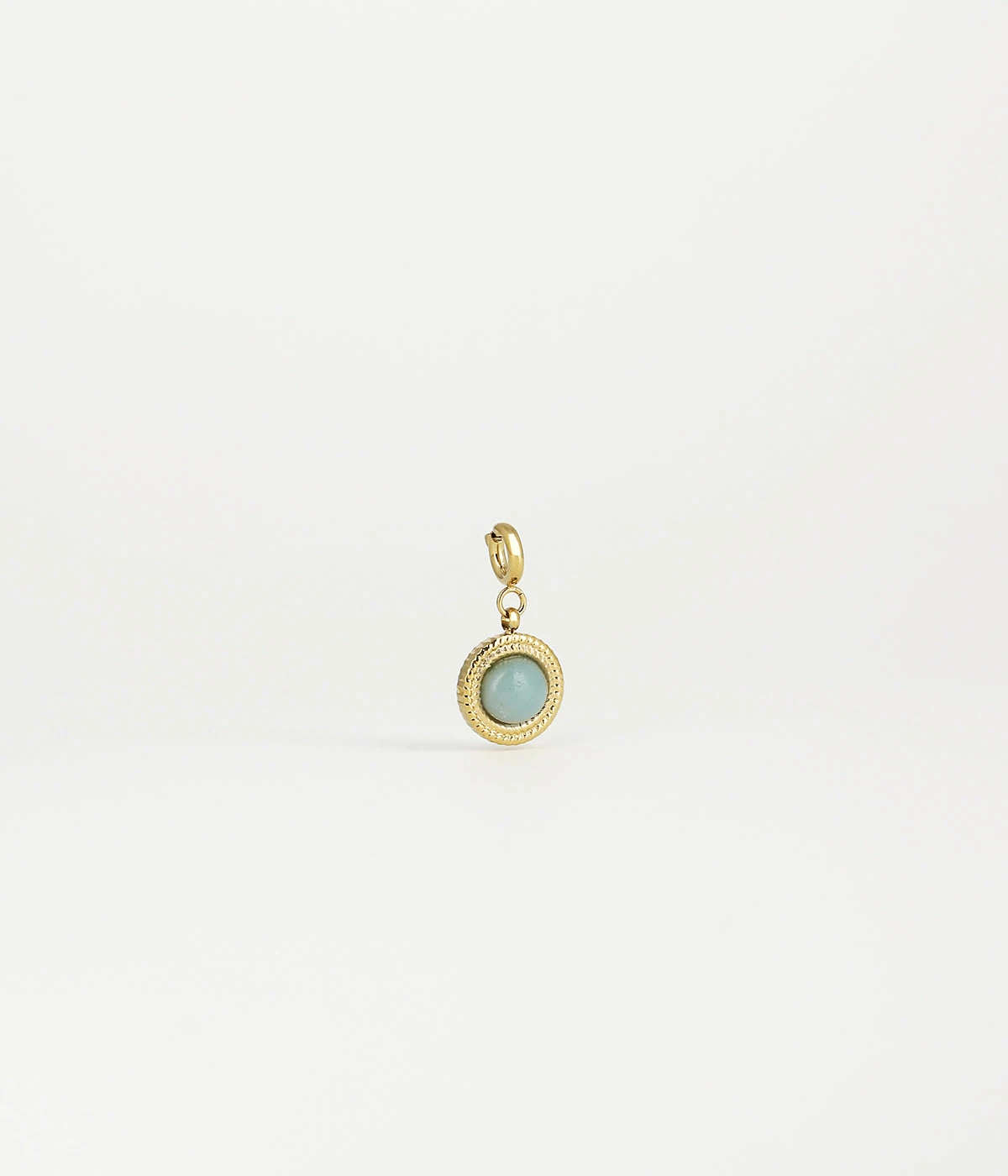Ce charm en acier dorĂ© Ă l’or fin, se compose d’un mousqueton sur lequel est accrochĂ© un mĂ©daillon avec une pierre naturelle sertie en son milieu.