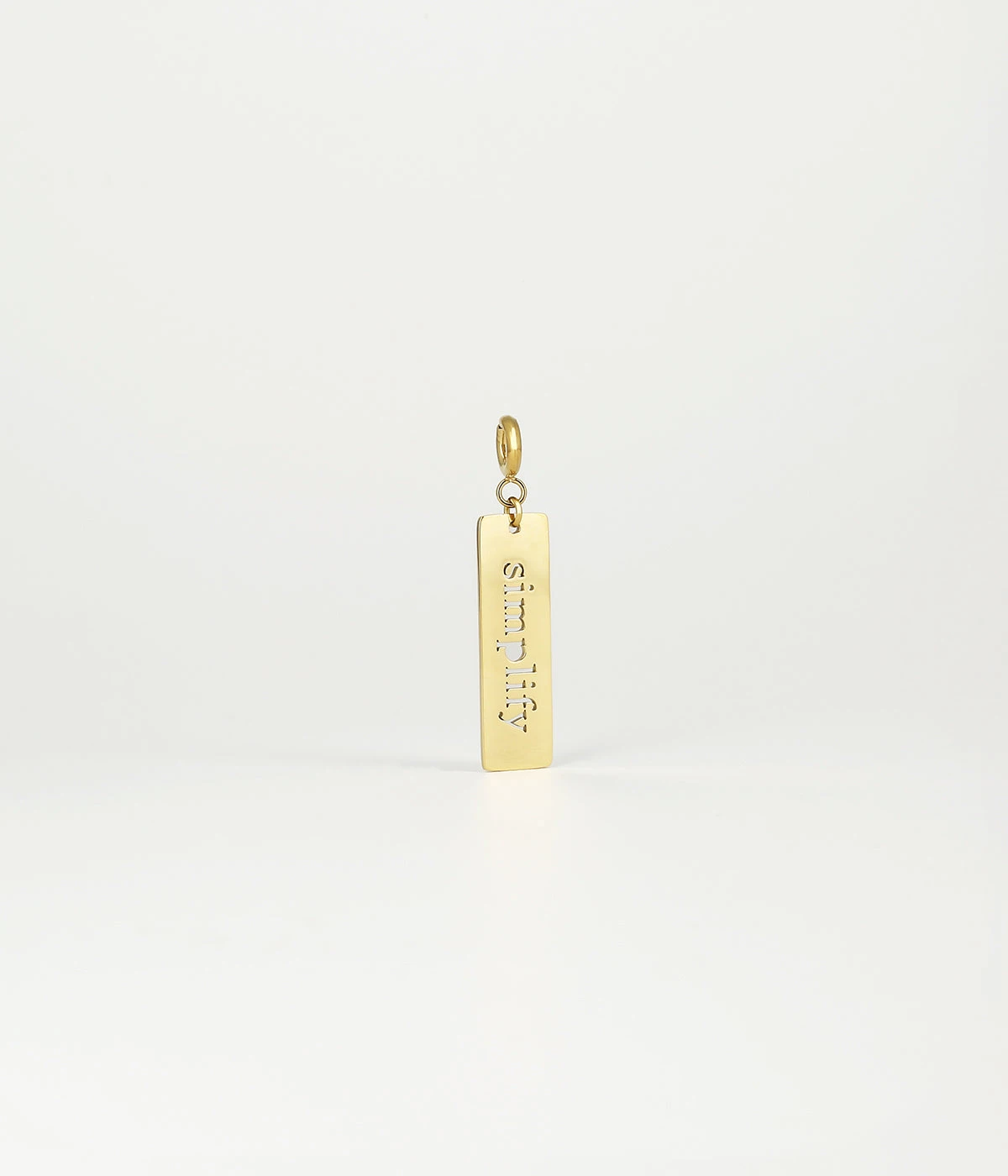 Ce charm en acier dorĂ© Ă l’or fin, se compose d’un mousqueton sur lequel est accrochĂ©e une plaque avec le mot « Simplify » ajourĂ©.