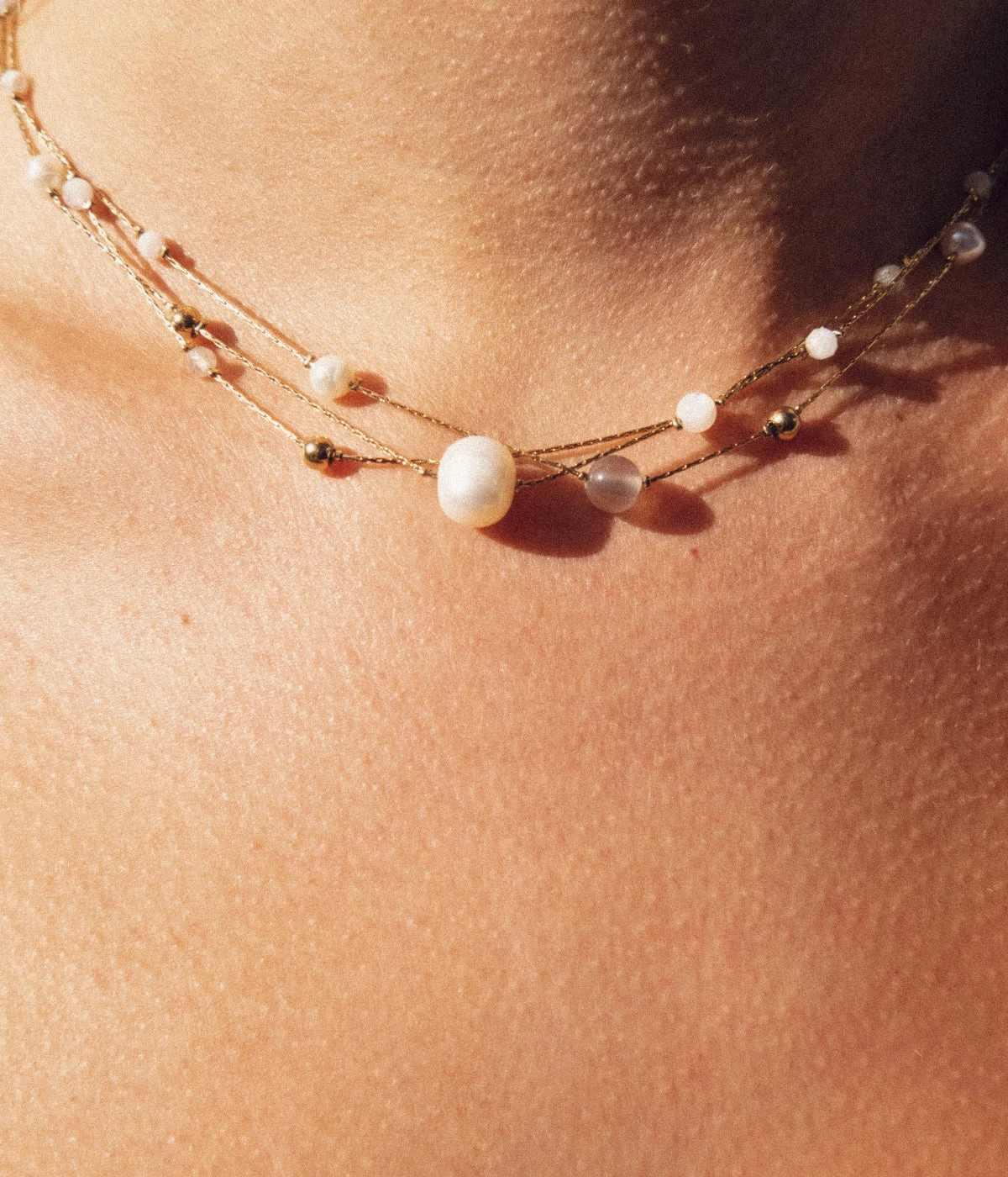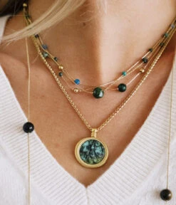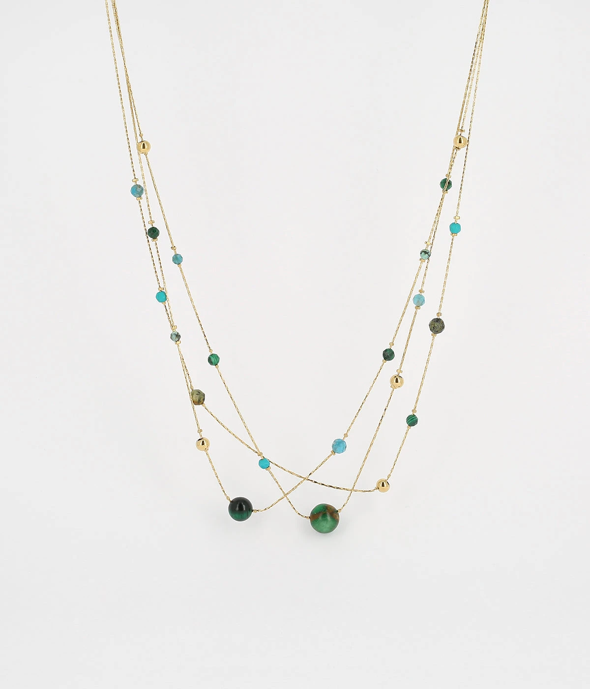 Collier multi-chaĂźnes en acier dorĂ© Ă l’or fin sur lequel sont enfilĂ©es des pierres naturelles et des boules en acier dorĂ©.