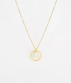 Collier en acier uni ou dorĂ© Ă l’or fin sur lequel est suspendu un pendentif composĂ© d’un cercle en acier avec en son centre un rectangle en nacre.