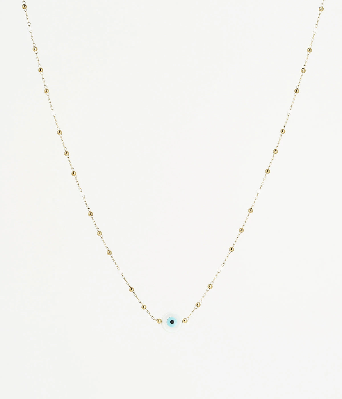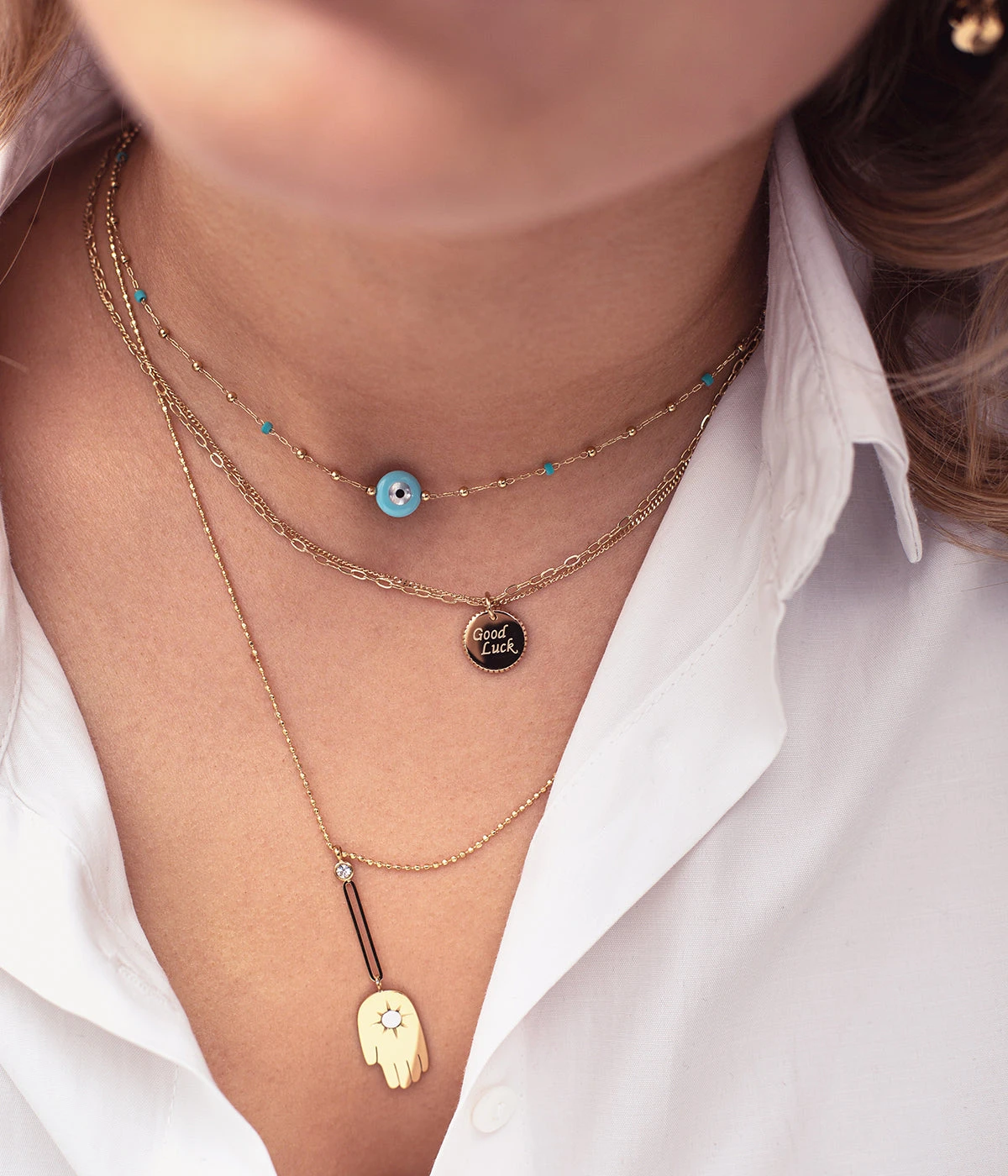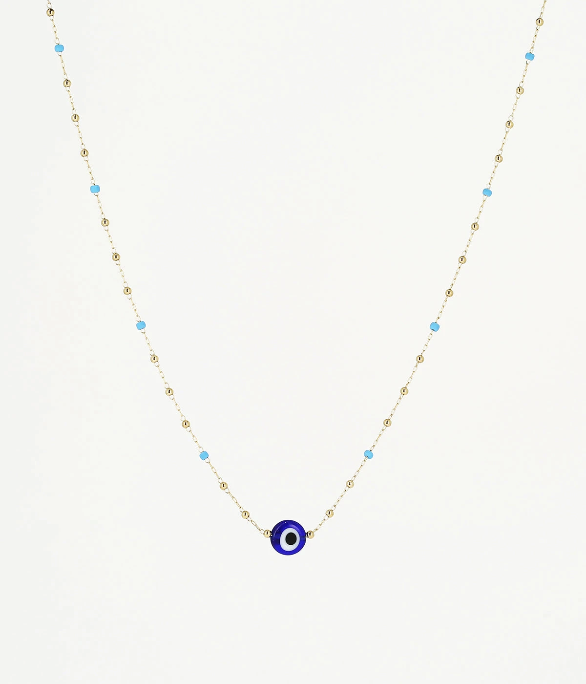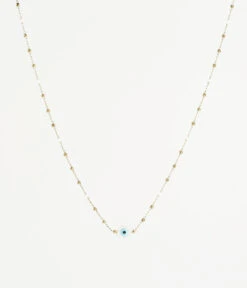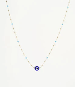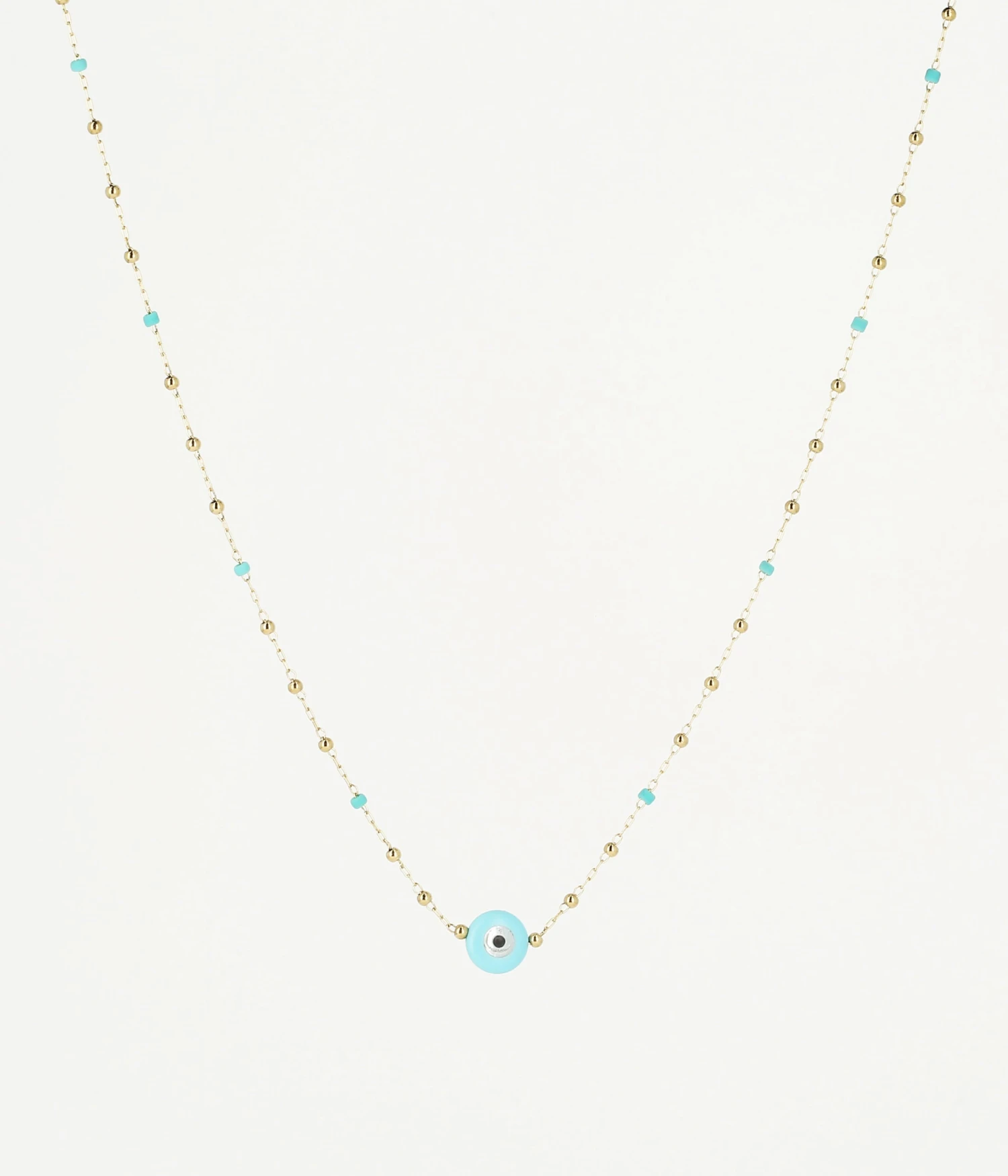 Collier chaĂźne « chapelet » en acier uni et dorĂ© Ă lâor fin sur lequel est attachĂ© un motif de rĂ©sine colorĂ© reprĂ©sentant un petit Ćil protecteur.