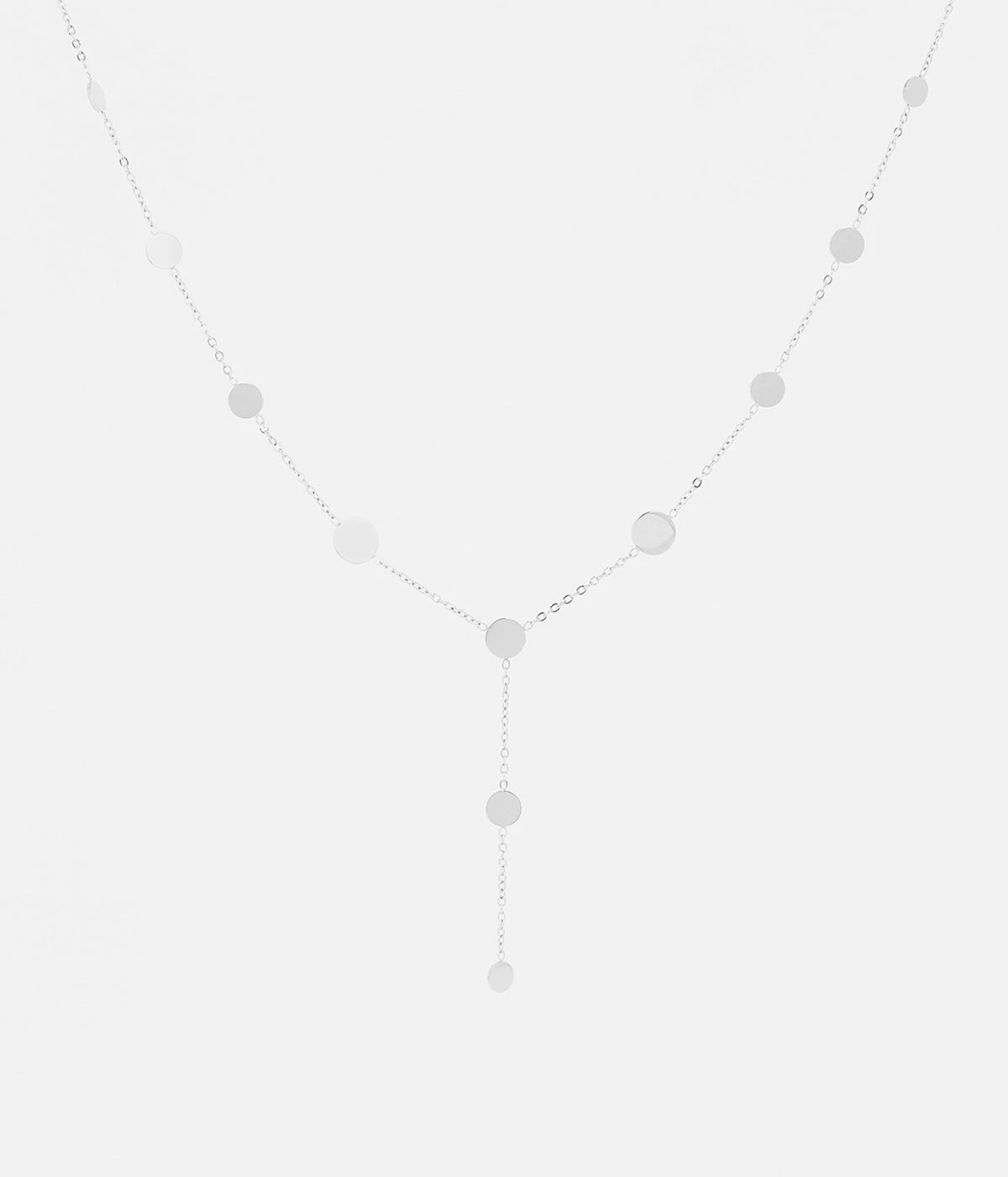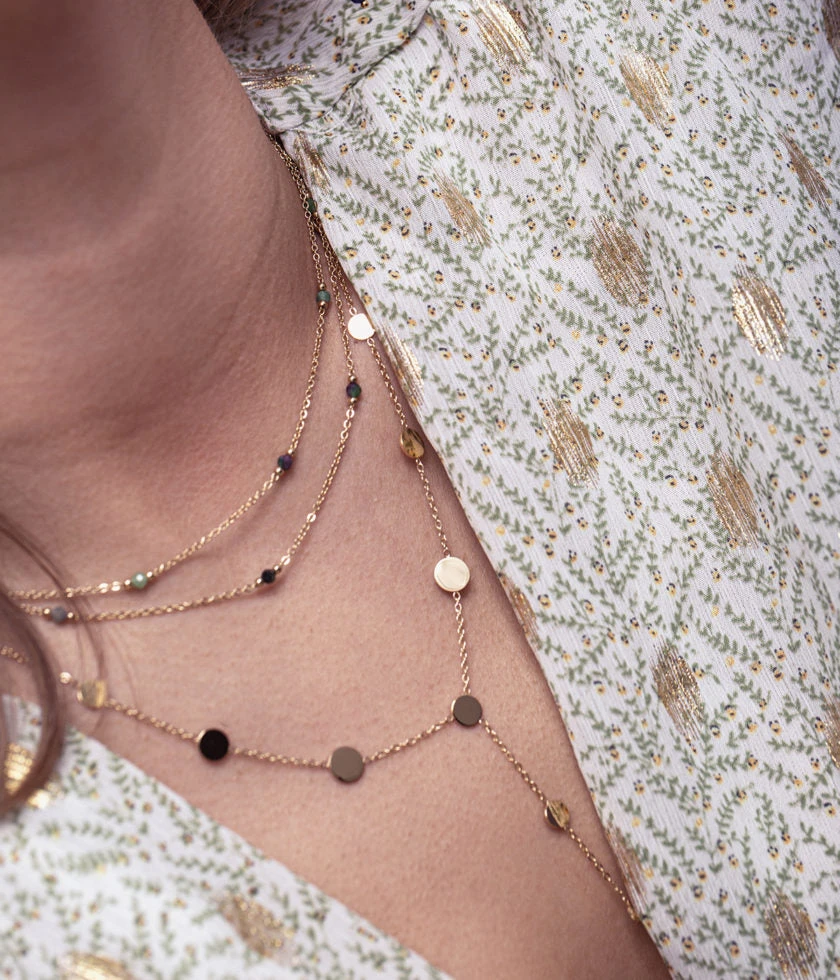 Collier chaînette en acier uni ou doré à l’or fin parsemé de petites plaques rondes brillantes de différentes tailles.