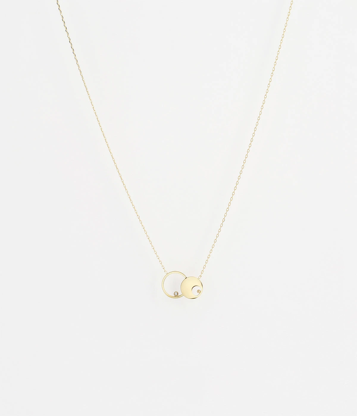 Collier en acier uni ou dorĂ© Ă l’or fin sur lequel deux cercles sont attachĂ©s.