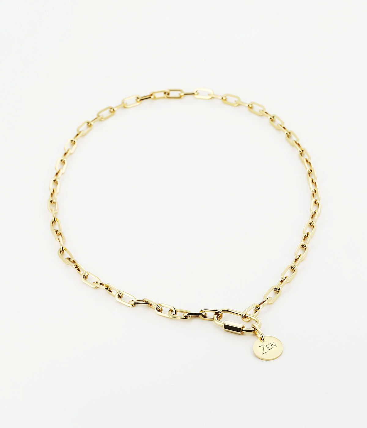 Collier chaĂźne Ă gros maillons en acier uni ou dorĂ© Ă lâor fin sur lequel est attachĂ©e une mĂ©daille gravĂ©e du mot « Zen ».