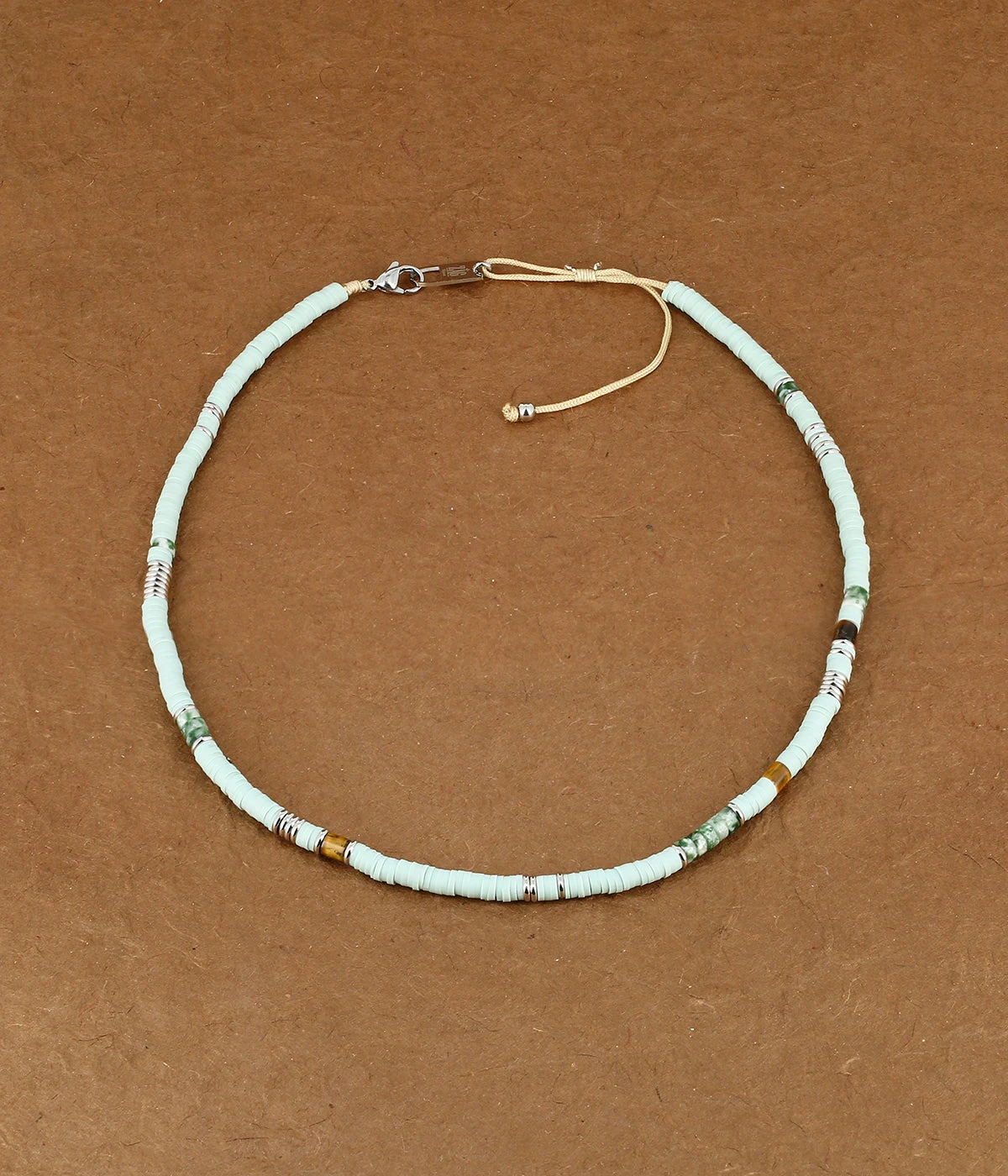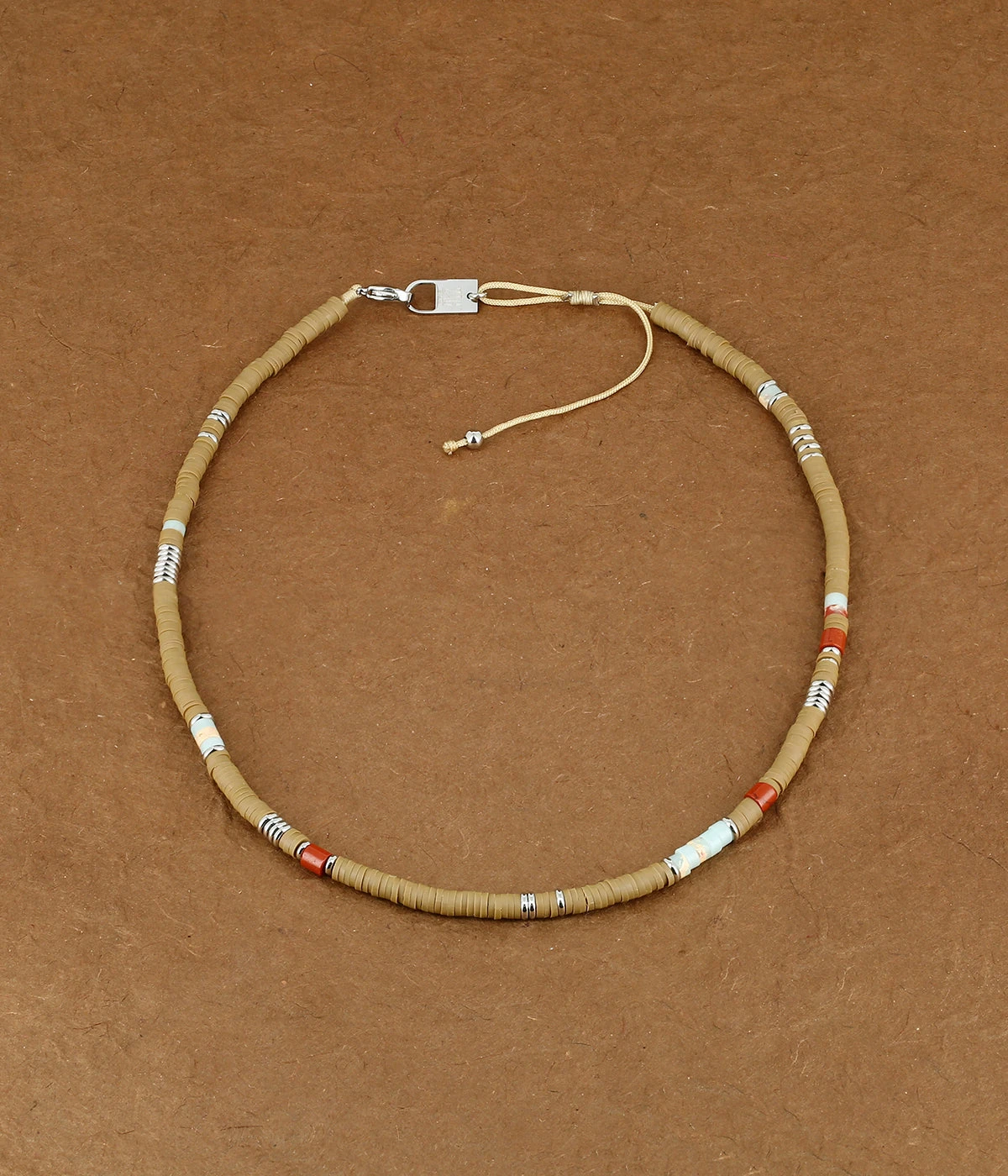 Collier ajustable sur lequel sont enfilĂ©es des rondelles colorĂ©es et d’acier uni.