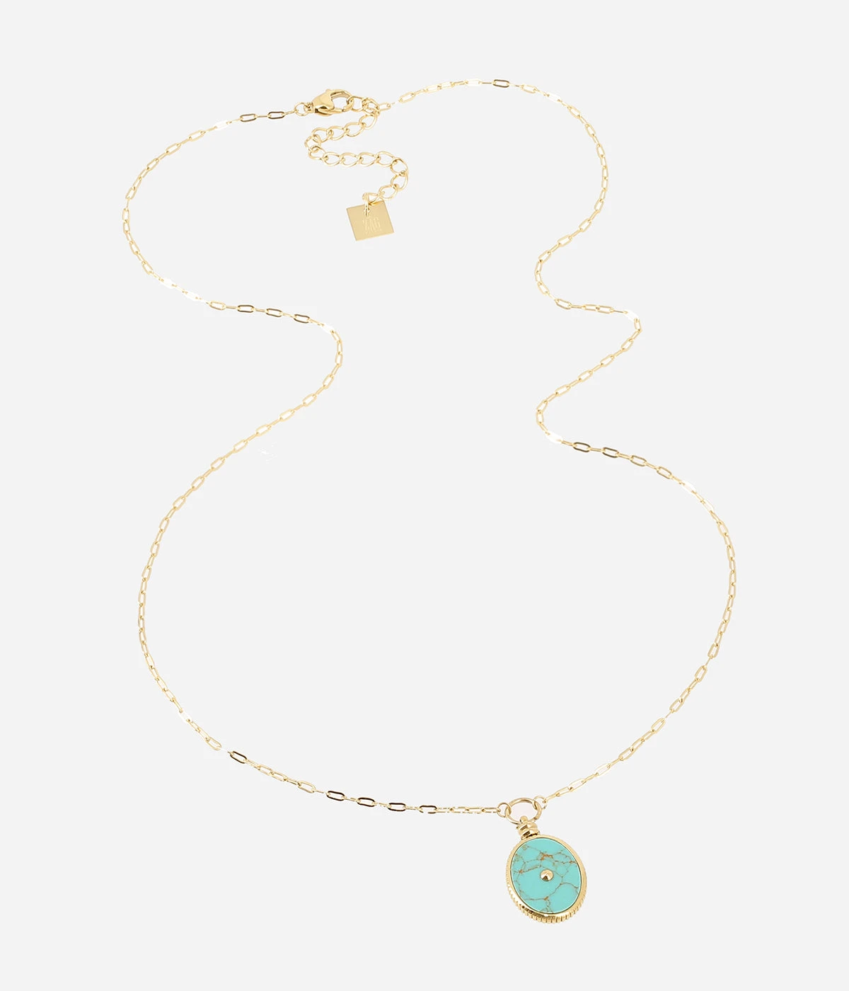 Collier en acier dorĂ© Ă l’or fin sur lequel est attachĂ© un pendentif ovale en pierre naturelle.
