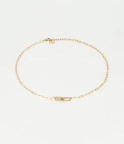 Collier maillons en acier dorĂ© Ă lâor fin sur lequel sont attachĂ©s des maillons, un colorĂ©, et l’autre serti de zirconiums.
