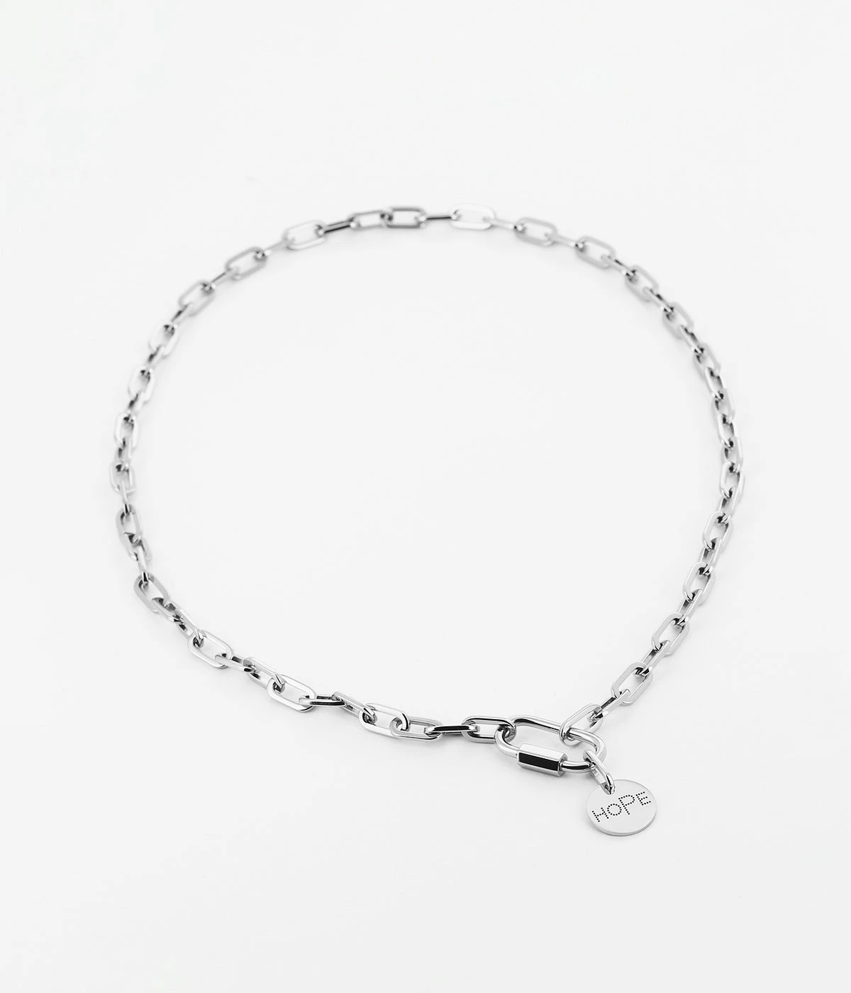 Collier chaĂźne Ă gros maillons en acier uni ou dorĂ© Ă lâor fin sur lequel est attachĂ©e une mĂ©daille gravĂ©e du mot « Hope ».