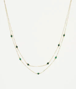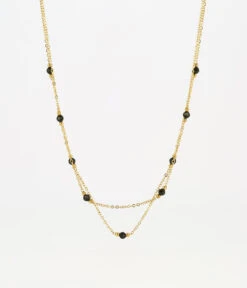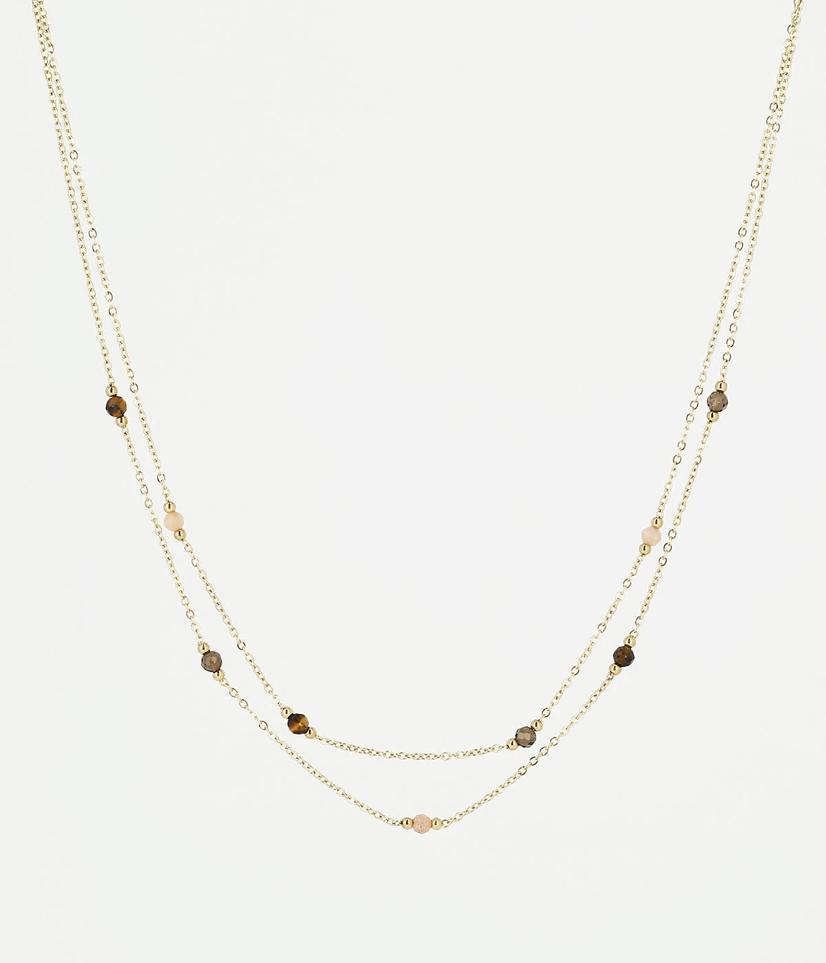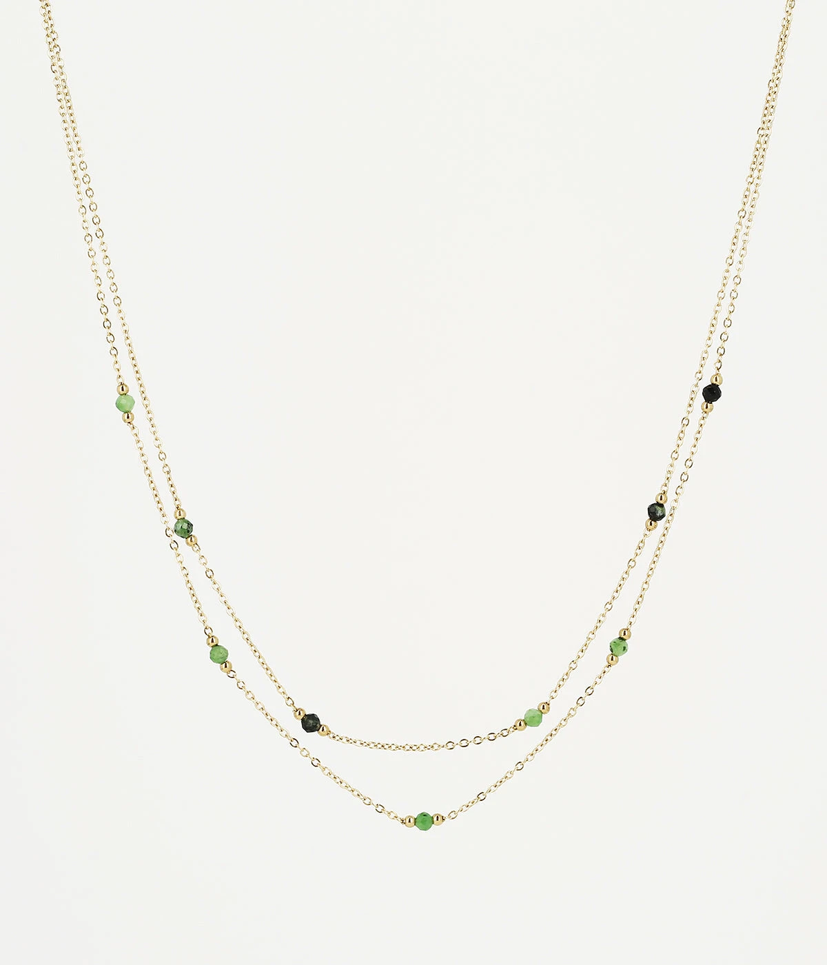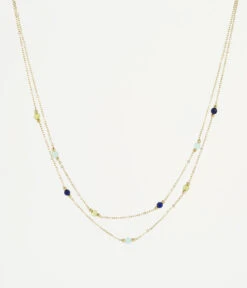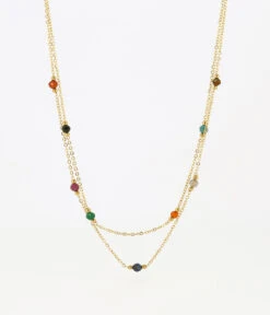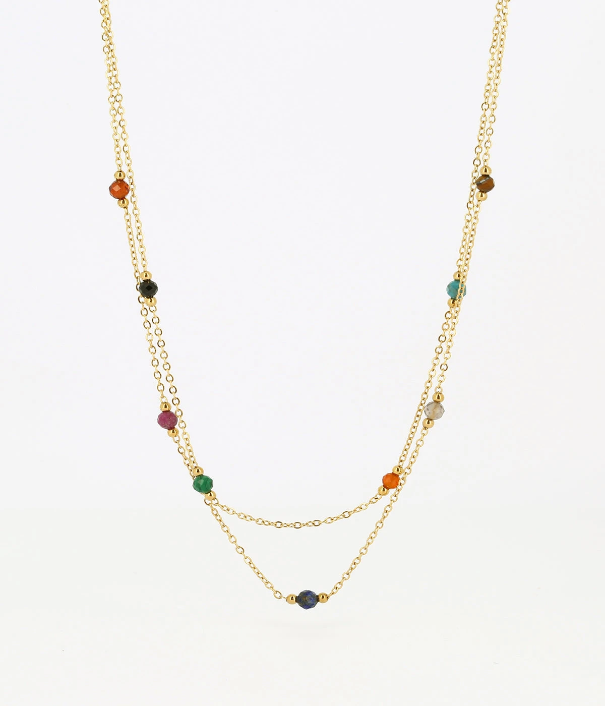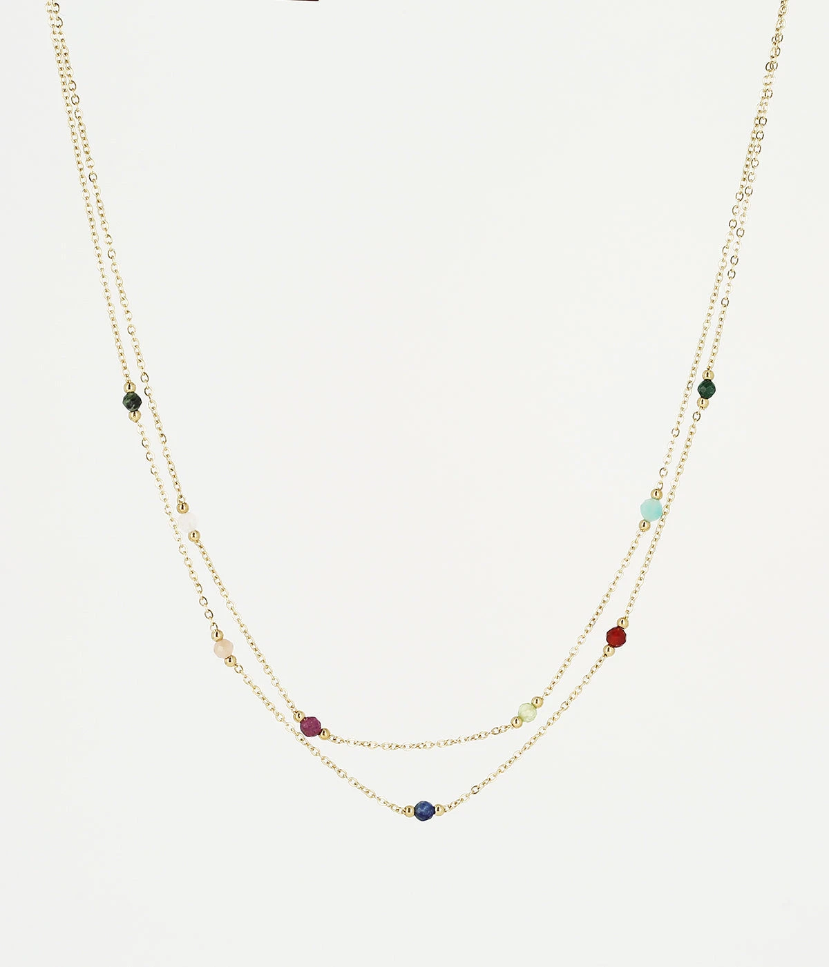 Collier double chaĂźne en acier dorĂ© Ă lâor fin parsemĂ© de pierres naturelles.