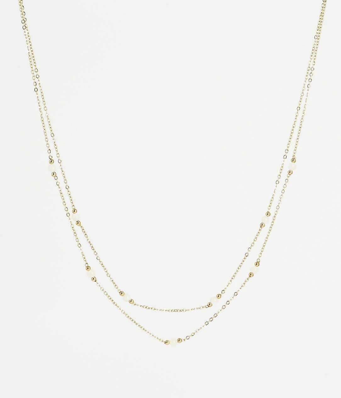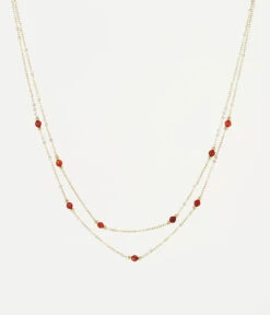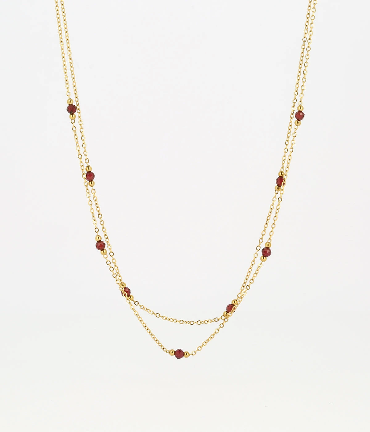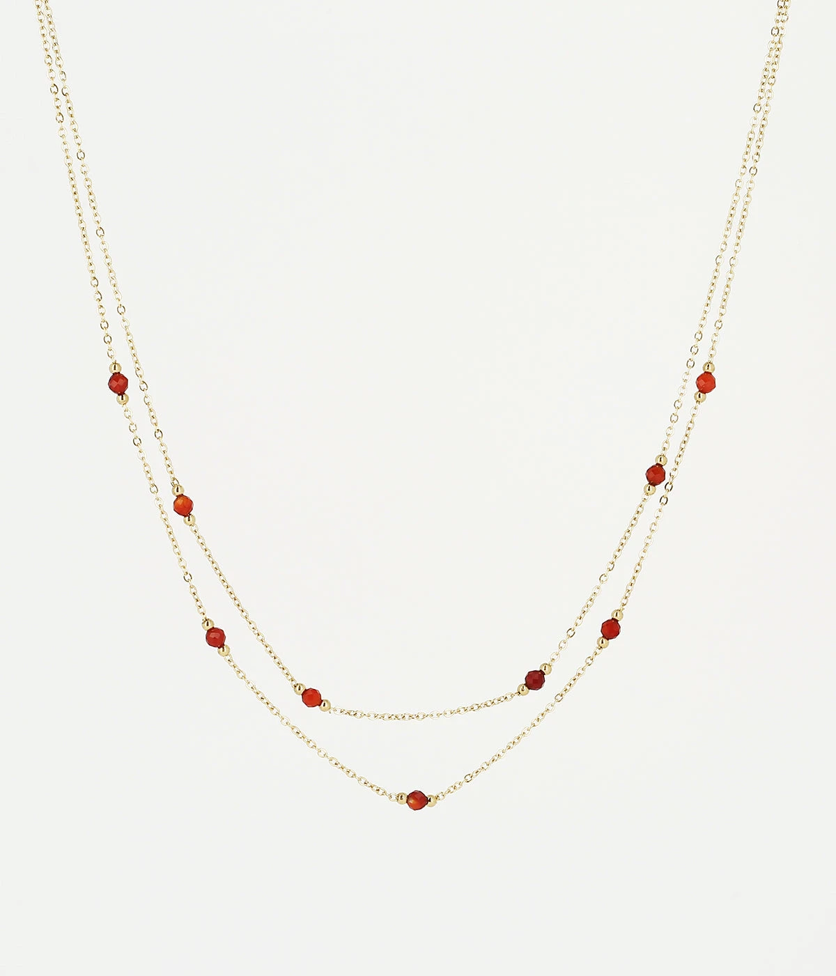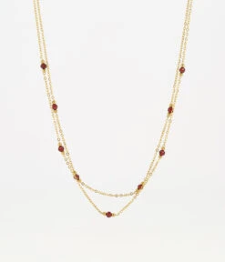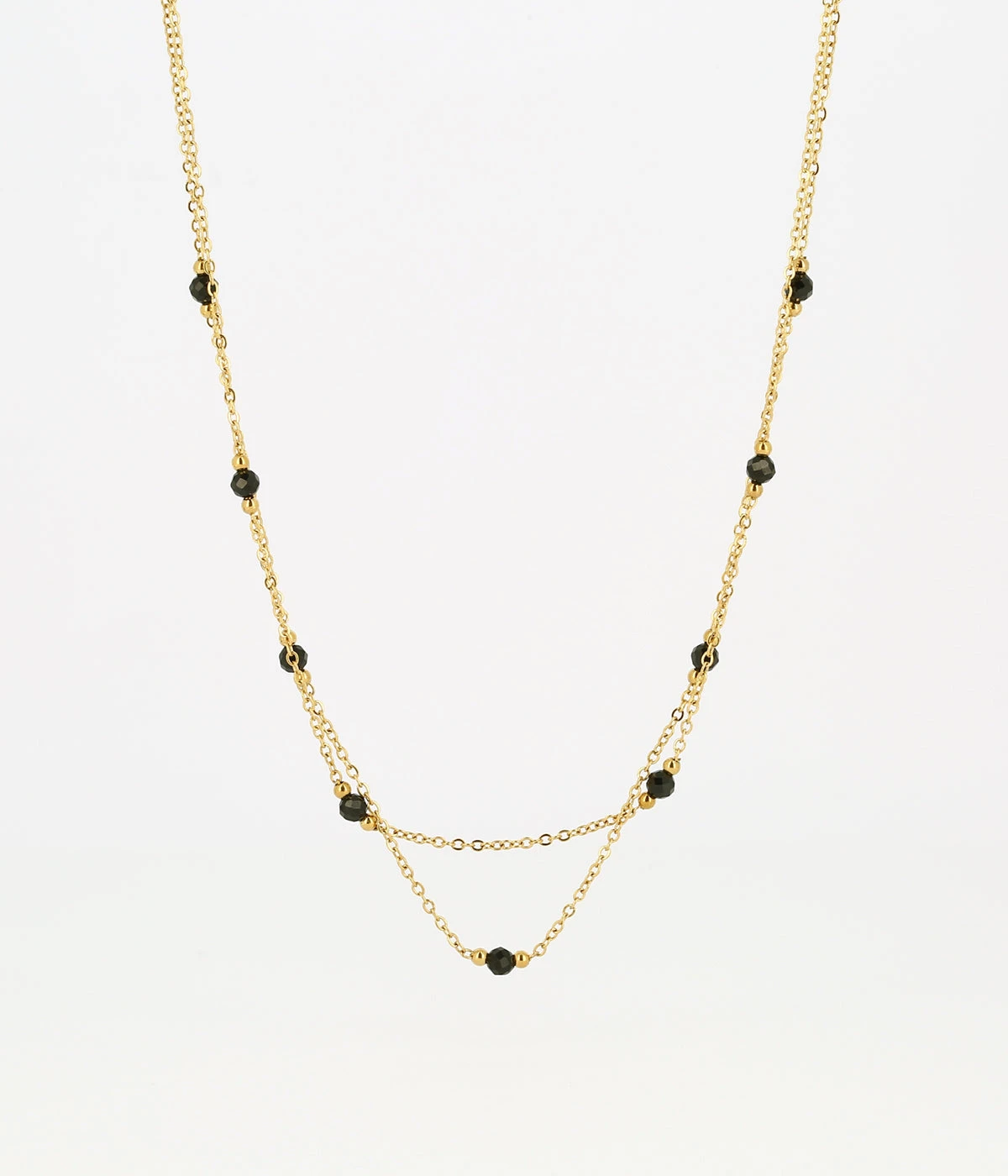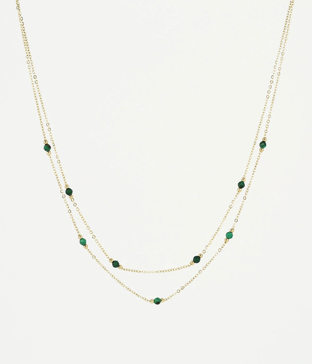 Collier double chaĂźne en acier dorĂ© Ă lâor fin parsemĂ© de pierres naturelles.
