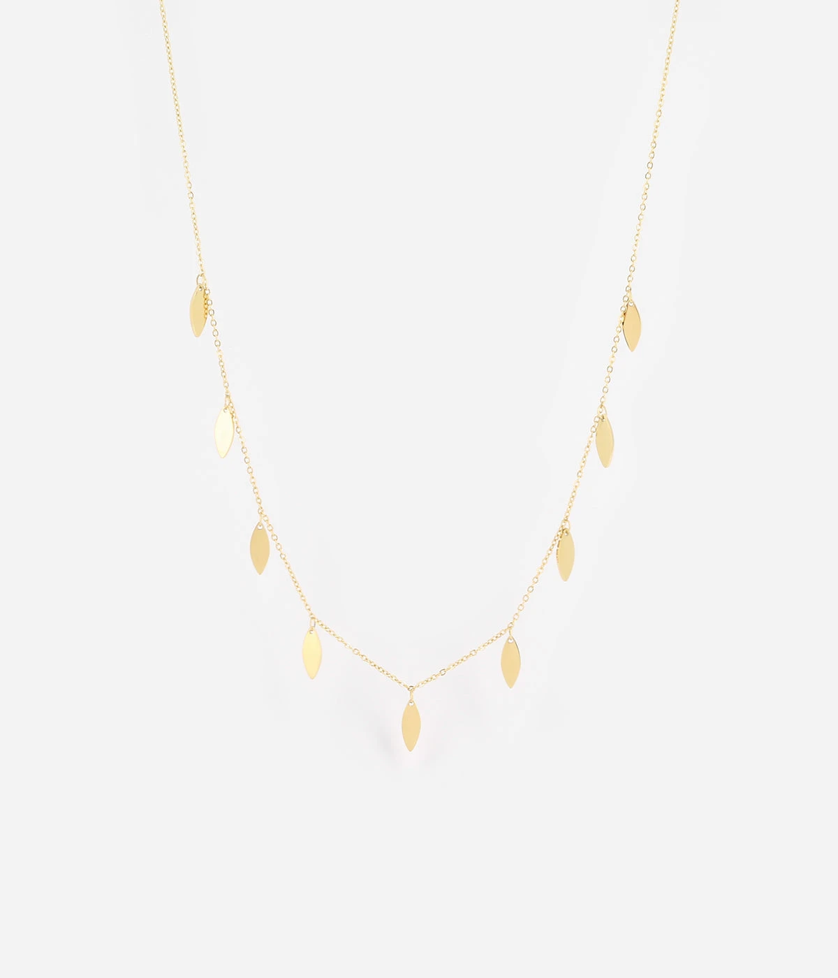 Similaire Ă notre incontournable collier « Confettis », cette nouvelle piĂšce en acier uni ou dorĂ© Ă l’or fin est composĂ©e de petites pampilles plates en mĂ©tal imitant une feuille de thĂ©.