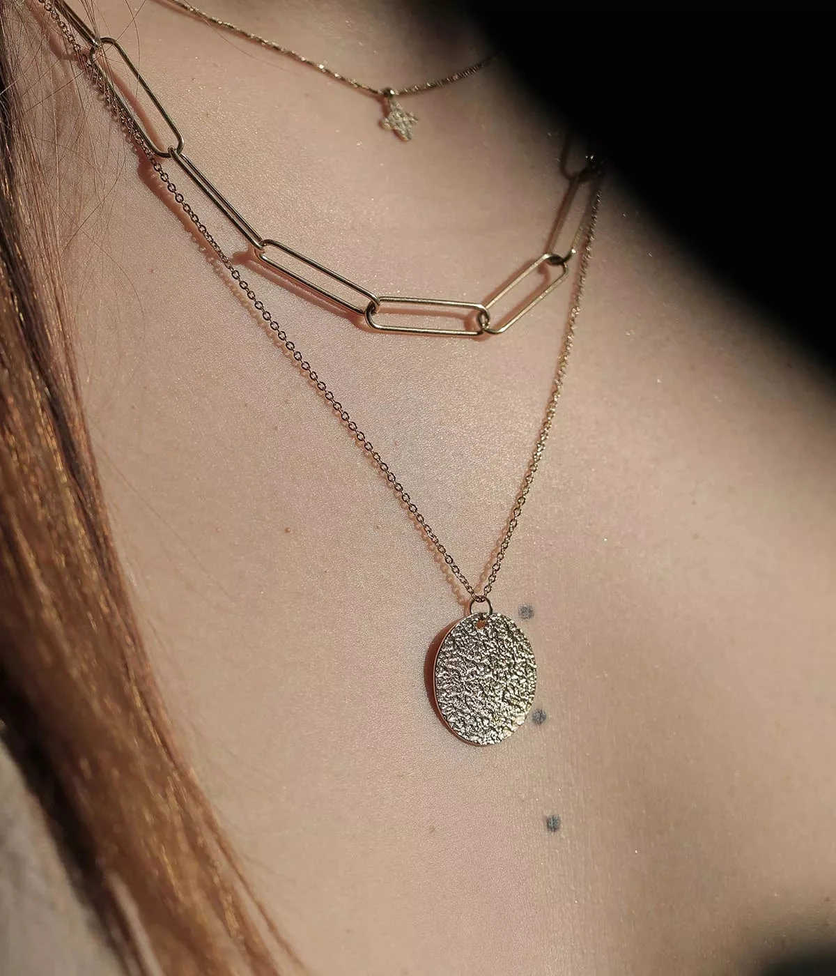 Collier double-chaĂźne en acier uni ou dorĂ© Ă l’or fin. Une premiĂšre chaĂźne Ă gros maillons trĂšs contemporaine est associĂ©e Ă une chaĂźne forçat classique sur laquelle est attachĂ©e une mĂ©daille martelĂ©e.