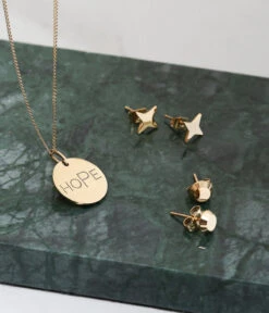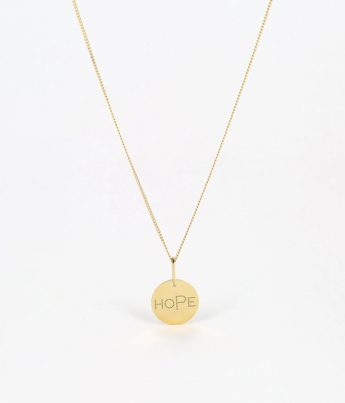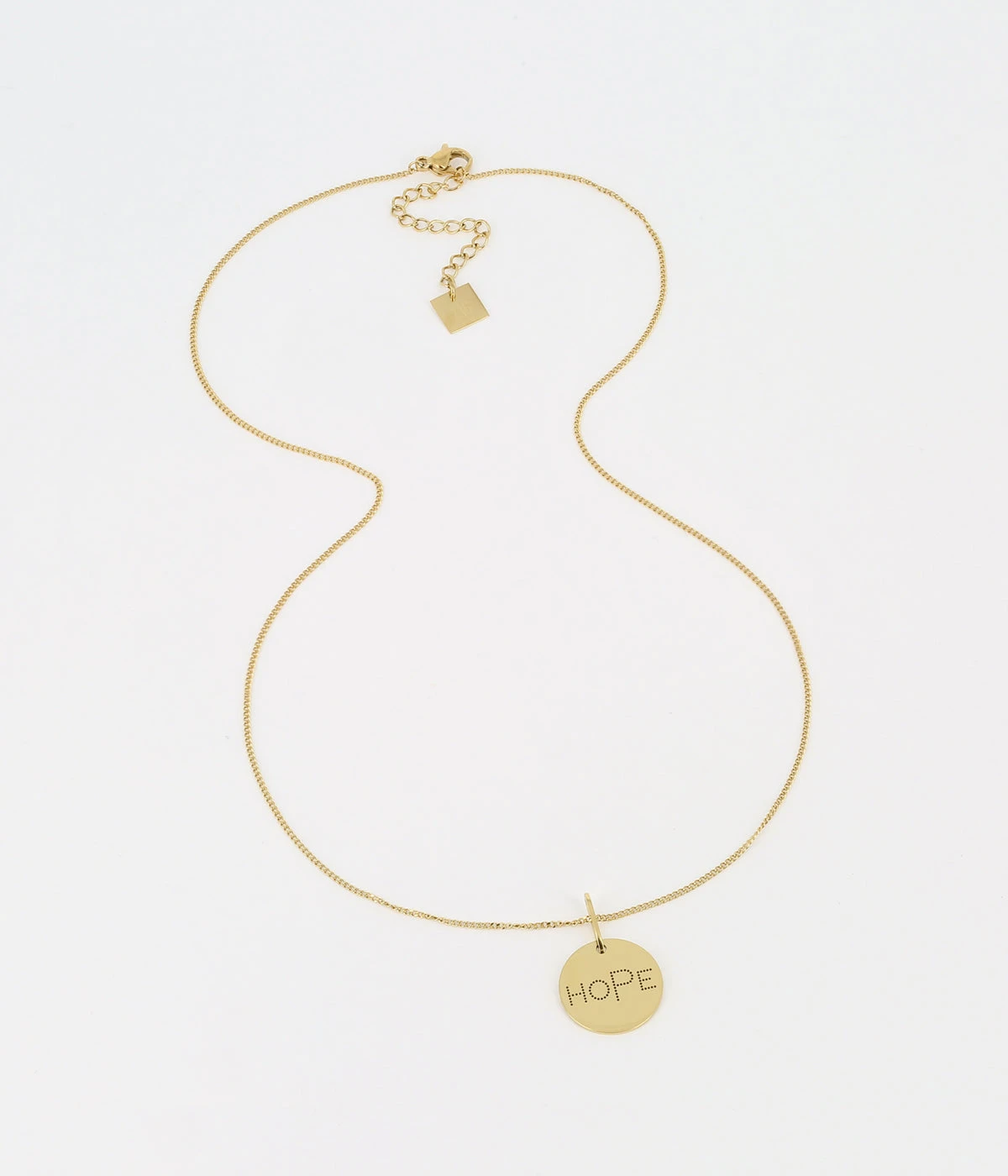 Collier chaĂźne en acier uni ou dorĂ© Ă lâor fin sur laquelle une mĂ©daille gravĂ©e du mot « Hope » est attachĂ©e.