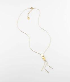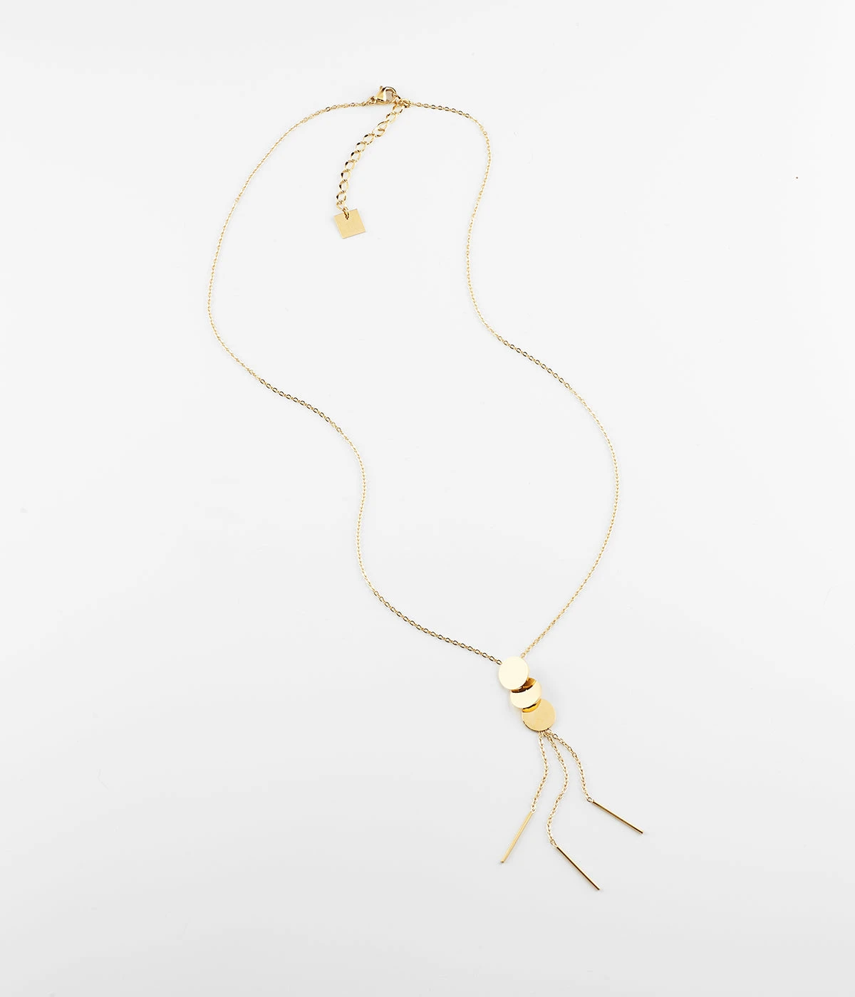 Collier en acier uni ou dorĂ© Ă l’or fin ornĂ© de trois mĂ©dailles de mĂ©tal sur lesquelles s’accrochent des chaĂźnettes terminĂ©es de fines tiges de mĂ©tal .