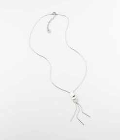 Collier en acier uni ou dorĂ© Ă l’or fin ornĂ© de trois mĂ©dailles de mĂ©tal sur lesquelles s’accrochent des chaĂźnettes terminĂ©es de fines tiges de mĂ©tal.