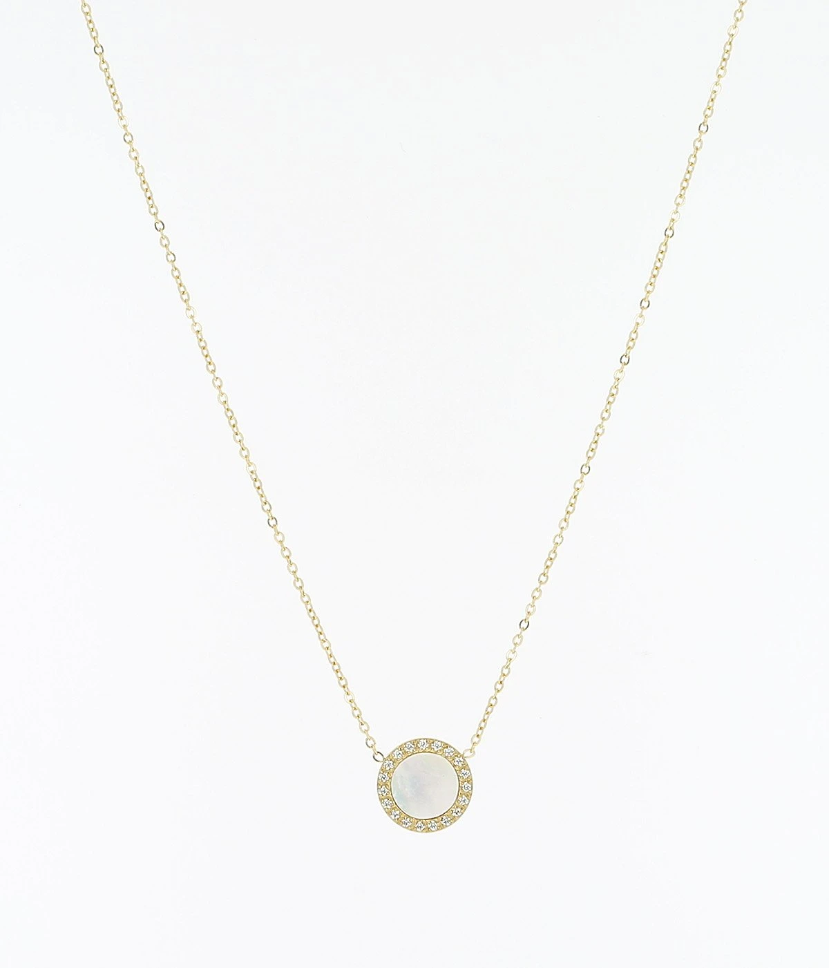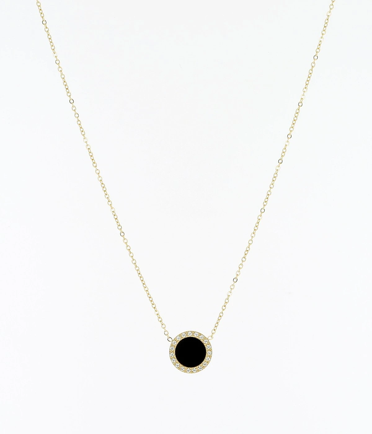 Collier chaĂźne en acier uni ou dorĂ© Ă l’or fin sur lequel est attachĂ©e une mĂ©daille de nacre ou de bakĂ©lite noire, sertie de zirconiums.