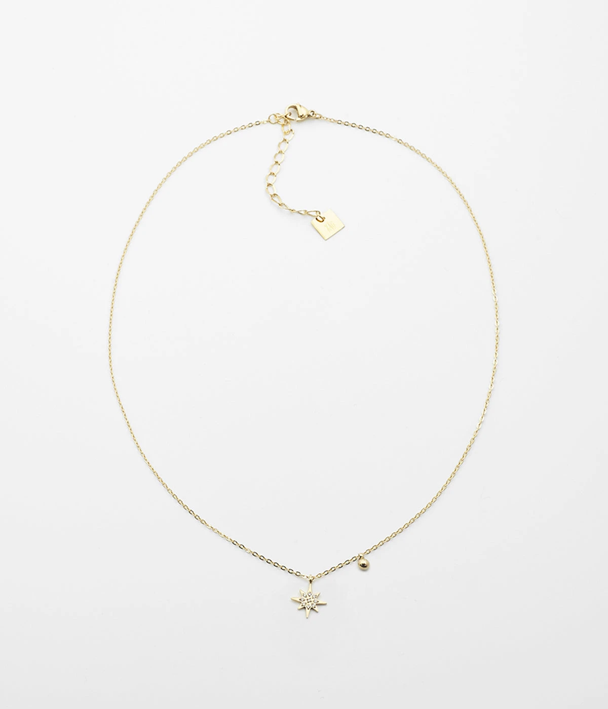 Collier chaĂźne en acier dorĂ© Ă l’or fin. Deux ornements sont attachĂ©es Ă la chaĂźne, l’un est un motif d’Ătoile du Nord sertie de zirconium et l’autre, une petite boule dorĂ©.