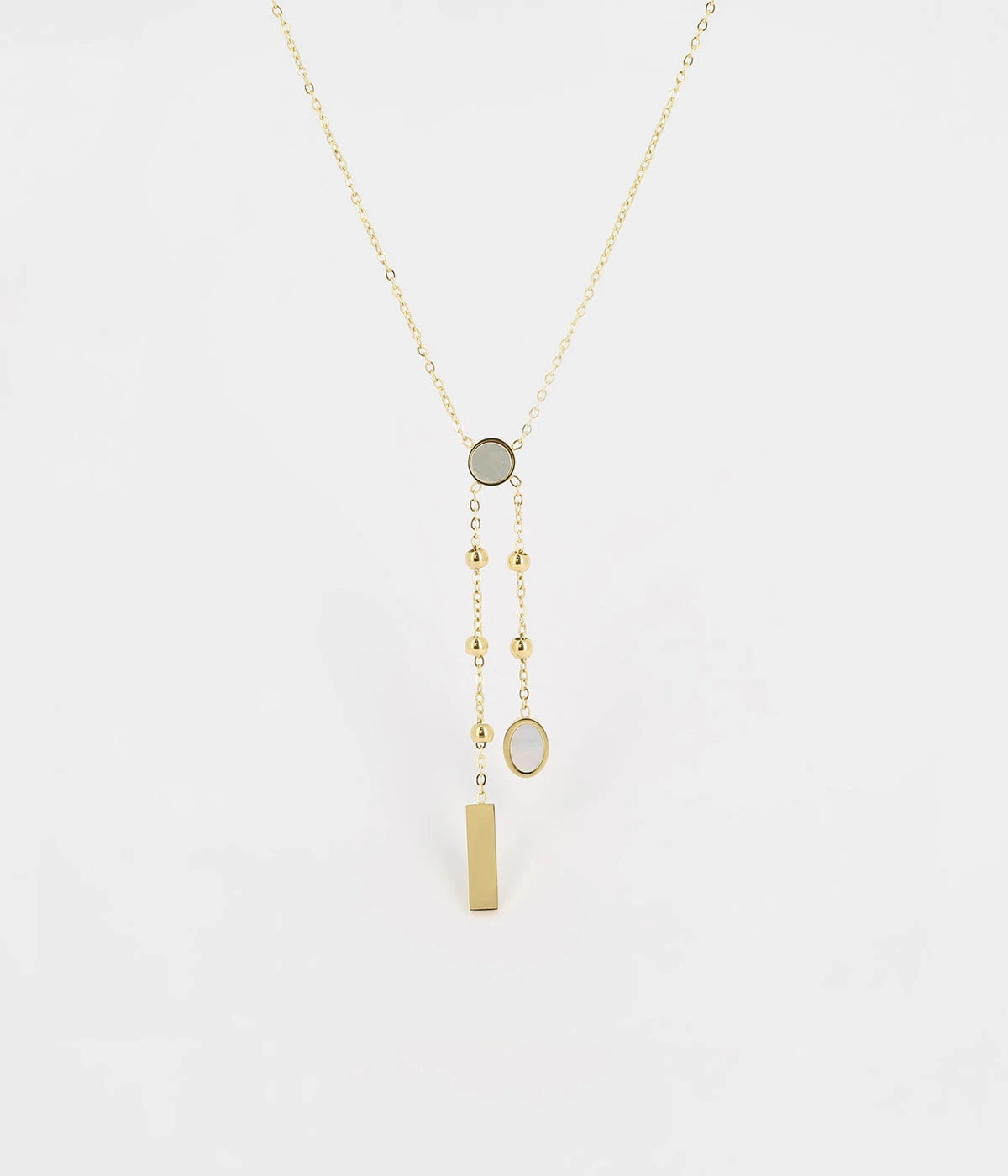 Collier en acier uni ou dorĂ© Ă l’or fin dont le pendentif nacrĂ© possĂšde 2 chaĂźnes tombantes, donnant une Ă©lĂ©gance au bijou.