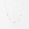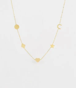 Collier en acier doré à l’or fin sur lequel sont attachés des motifs ajourés en forme de cercle, fleur, cœur et étoile.