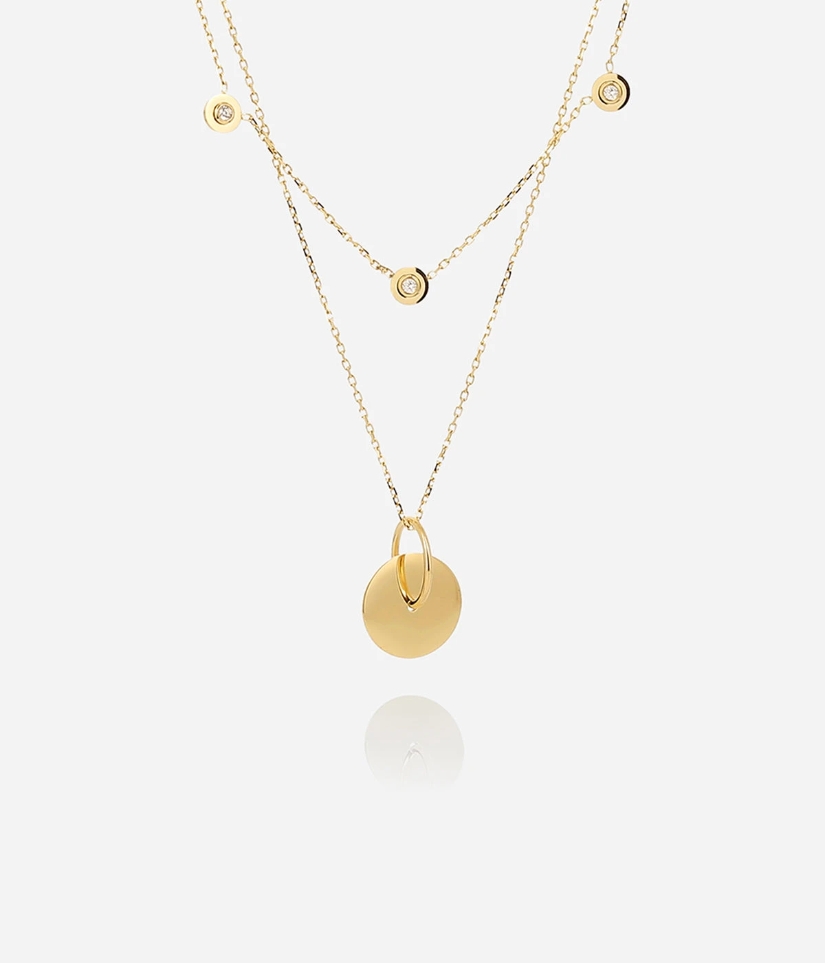 Sur la premiĂšre chaĂźne se trouvent trois pastilles serties d’un zirconium en leur centre et sur la seconde chaĂźne, un pendentif avec un cercle dans un anneau.