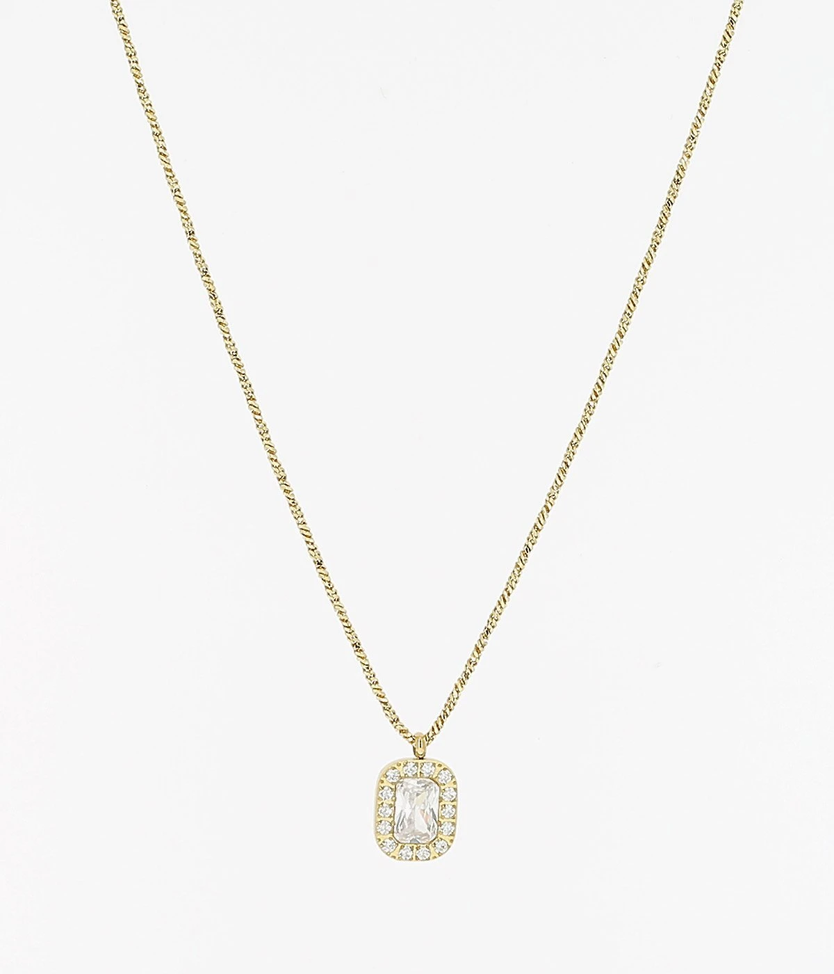 Collier chaßne sur lequel est attaché un motif de zirconium pavé. Discret et élégant, ce collier apporte beaucoup de lumiÚre prÚs du visage.