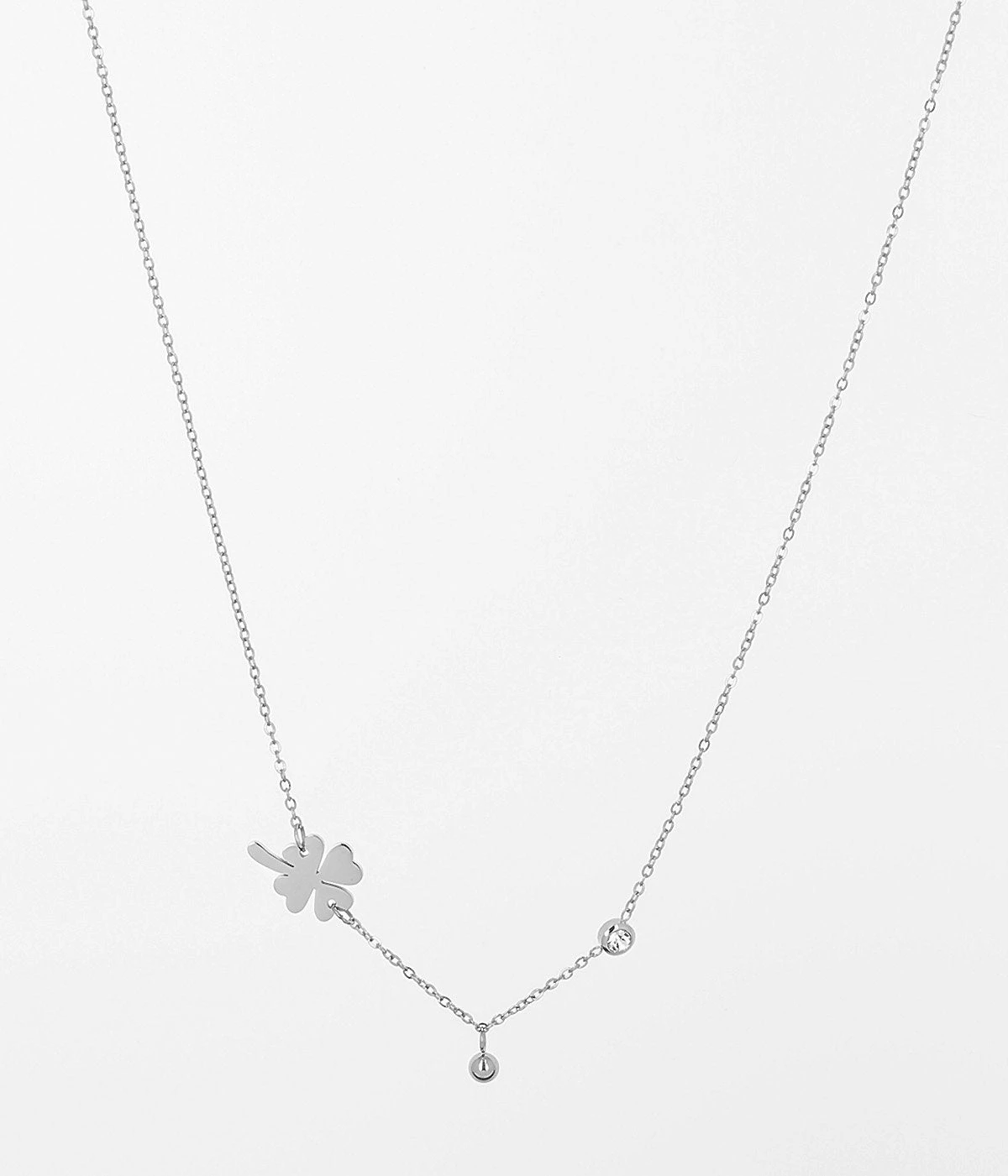 Collier chaĂźne en acier uni ou dorĂ© Ă lâor fin sur lequel est attachĂ© un dĂ©licat motif de trĂšfle Ă quatre feuilles et un zirconium serti clos.