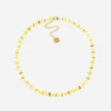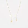 Collier en acier uni ou dorĂ© Ă l’or fin sur lequel sont enfilĂ©es des petites boules en acier. Sont suspendus un motif en forme d’Ćil et une plaque gravĂ©e du message « Good Luck ».