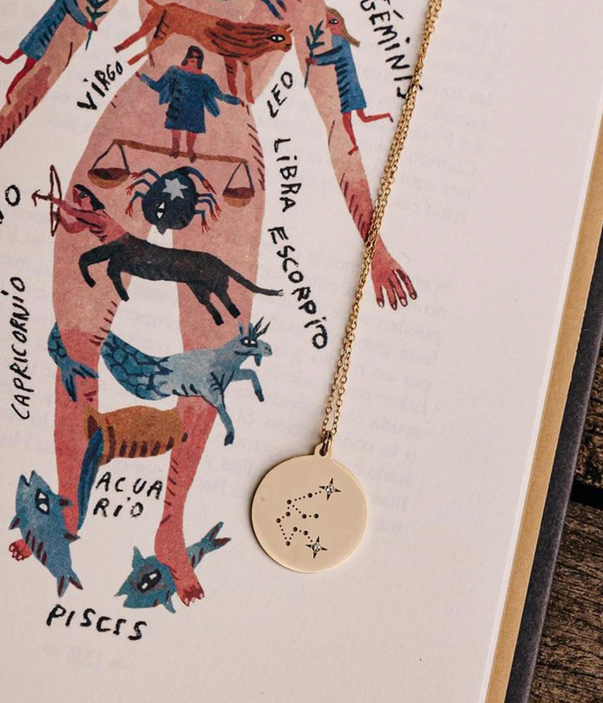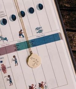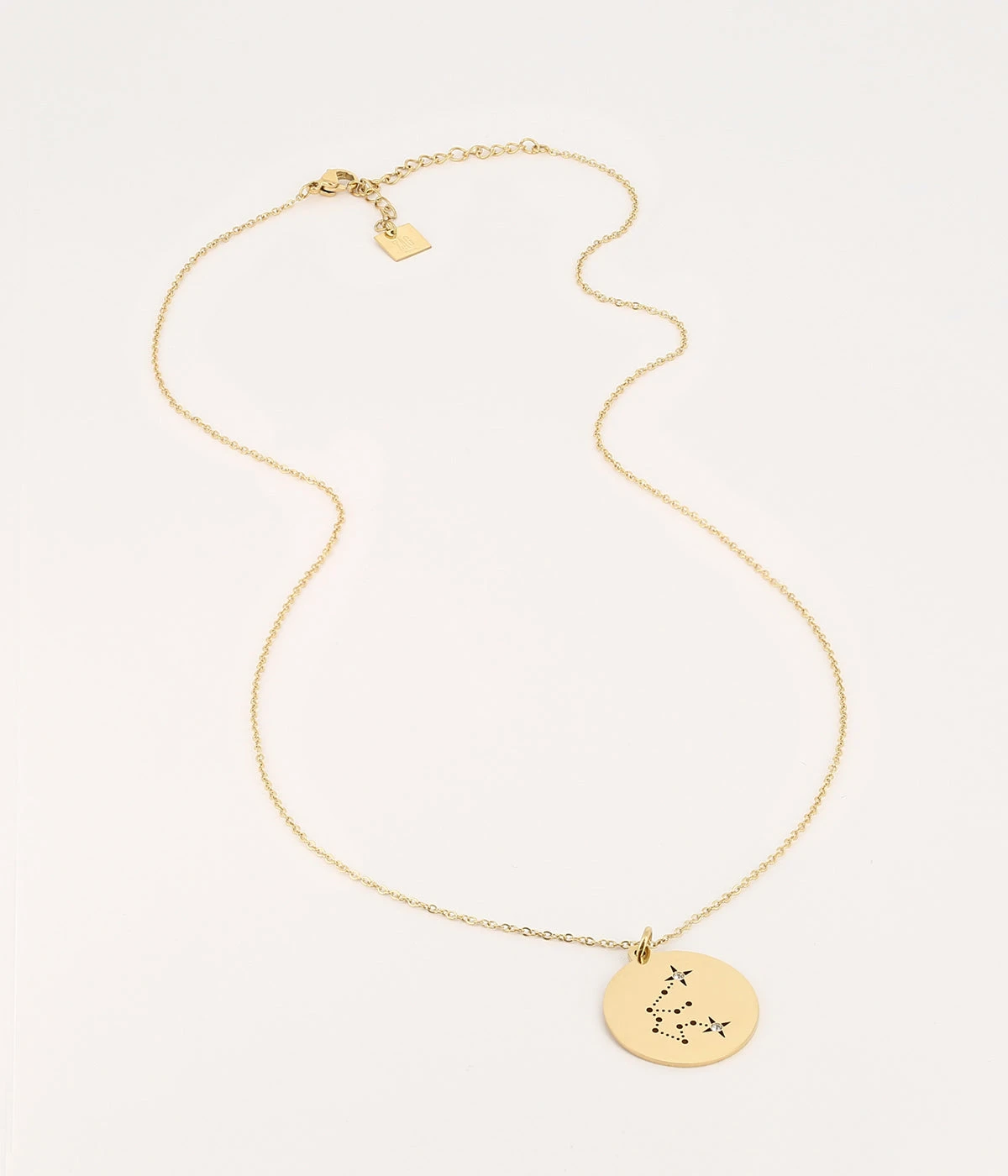 Collier en acier uni ou dorĂ© Ă l’or fin sur lequel est suspendu un pendentif gravĂ© de la constellation reprĂ©sentant le signe astrologique Verseau.