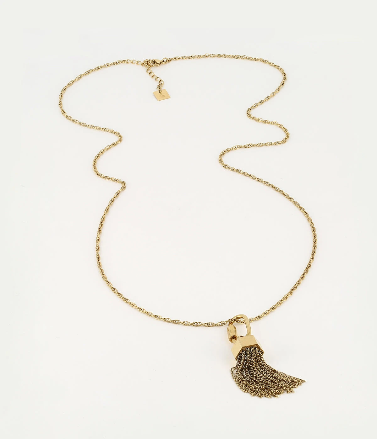 Collier long en acier uni ou dorĂ© Ă l’or fin sur lequel est attachĂ© un pendentif accrochĂ© Ă un fermoir Ă vis.