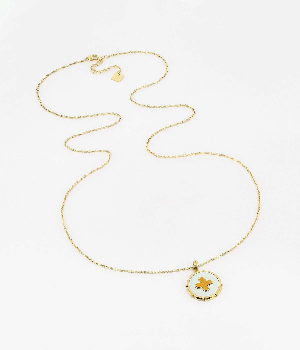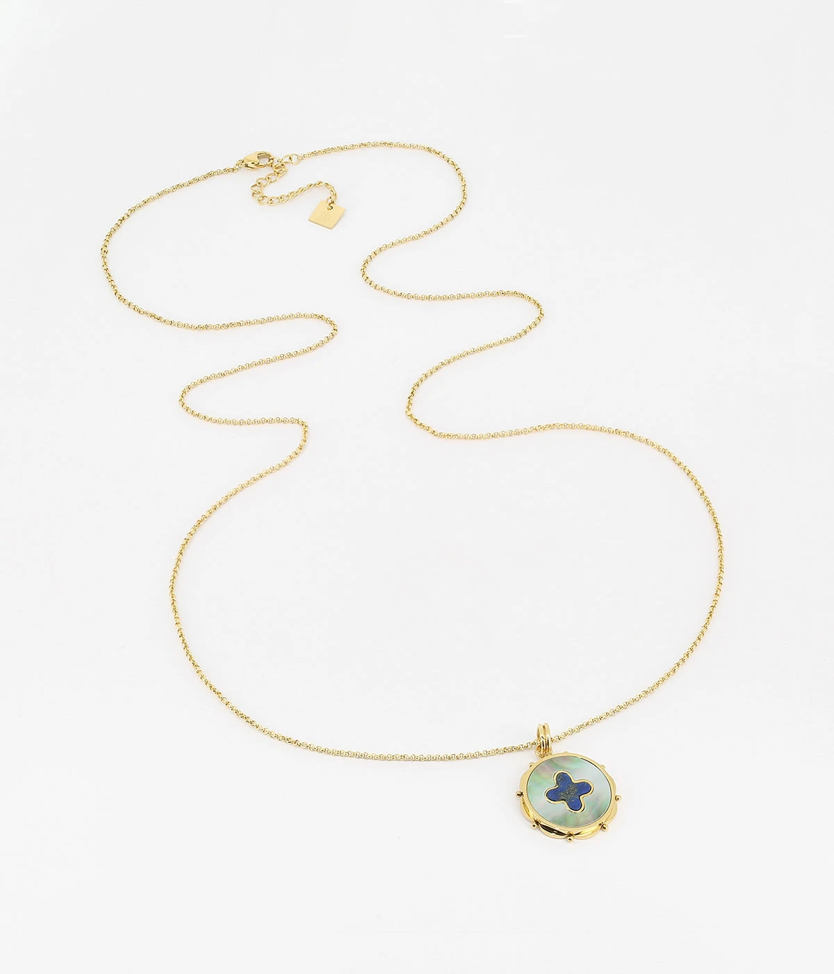 Collier long en acier dorĂ© Ă l’or fin sur lequel est attachĂ© un pendentif en nacre serti d’une pierre naturelle.