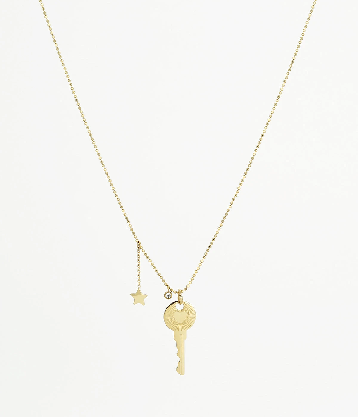 Collier long en acier uni ou dorĂ© Ă lâor fin sur lequel est suspendue une clĂ© gravĂ©e dâun cĆur. Une Ă©toile en pampille et un petit zirconium se trouvent Ă©galement sur ce collier.
