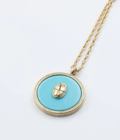 Collier long en acier dorĂ© Ă l’or fin, terminĂ© d’un pendentif d’acĂ©tate de couleur piquĂ© d’un scarabĂ©e dorĂ©.