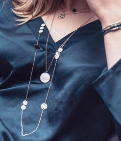 Collier long en acier uni ou dorĂ© Ă lâor fin sur lequel sont serties des petites plaques rondes brillantes. Ce sautoir sâinstalle avec finesse et Ă©clat sur le dĂ©colletĂ©.