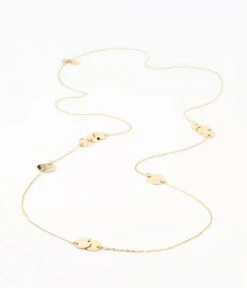 Collier long en acier uni ou dorĂ© Ă lâor fin sur lequel sont serties des petites plaques rondes brillantes. Ce sautoir sâinstalle avec finesse et Ă©clat sur le dĂ©colletĂ©.