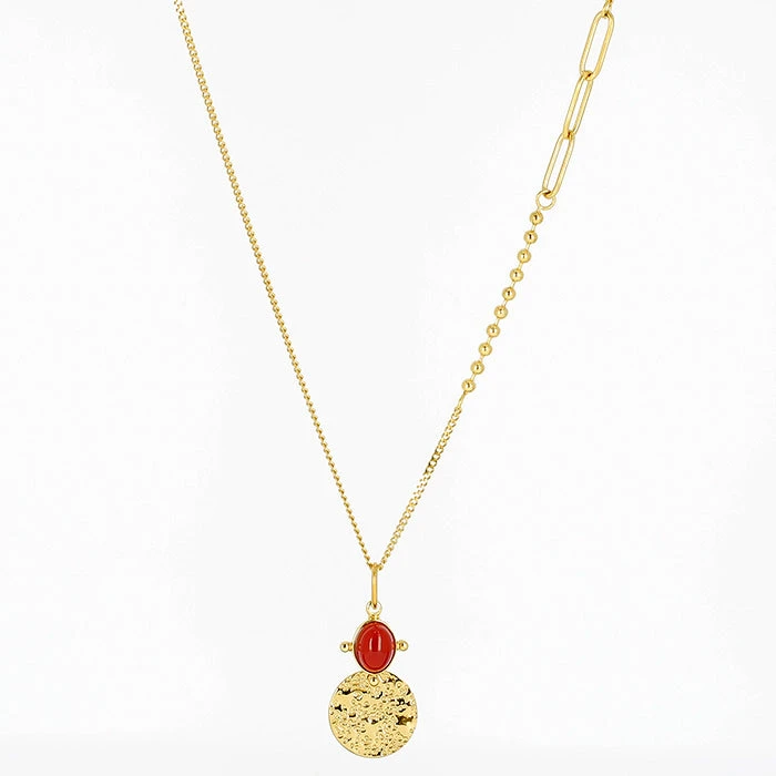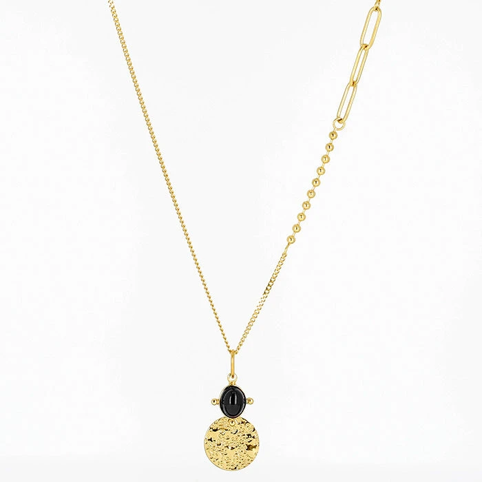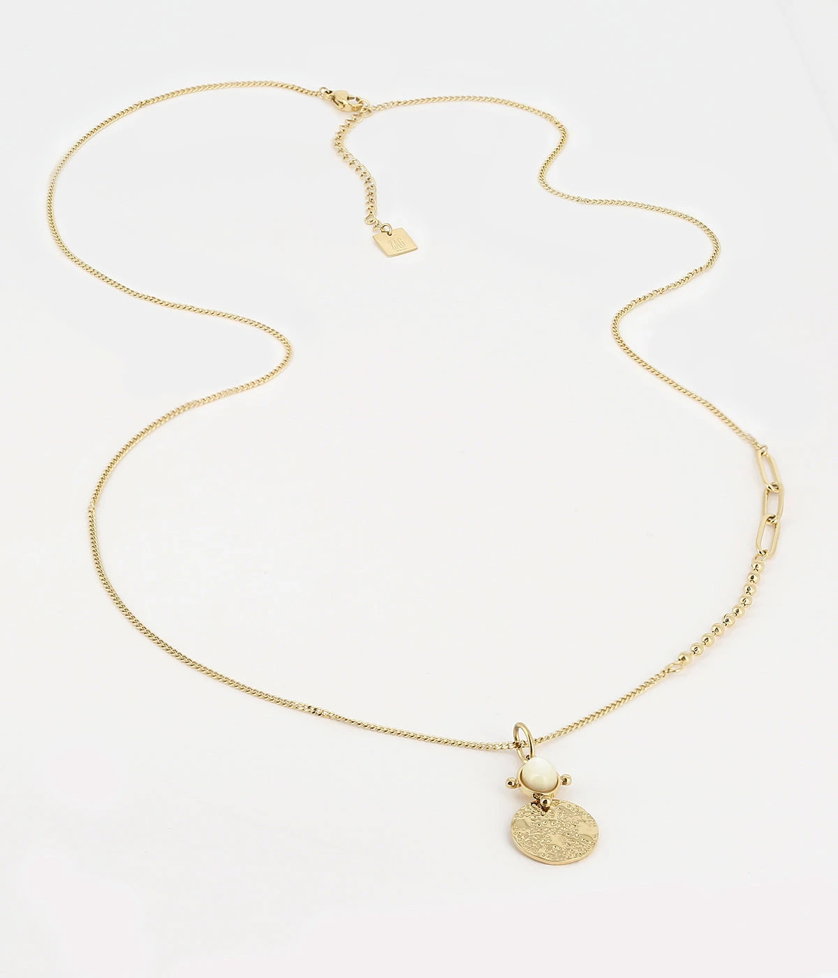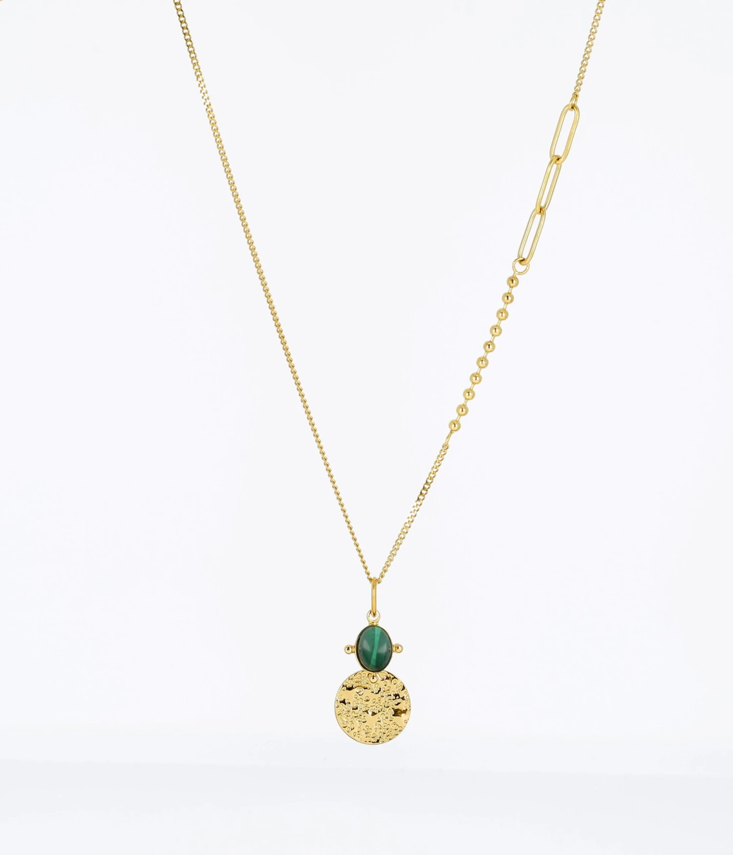 Collier long en acier dorĂ© Ă lâor fin sur lequel est attachĂ© un cabochon de pierre naturelle et une mĂ©daille martelĂ©e. La chaĂźne dans sa longueur est parsemĂ©e de diffĂ©rents maillons donnant une allure contemporaine Ă ce sautoir.