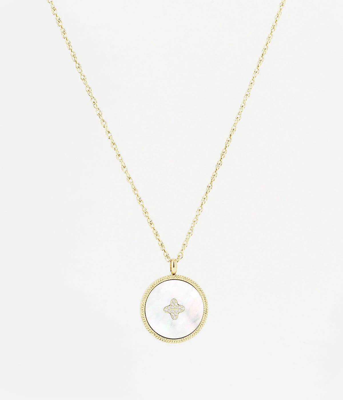 Collier long en acier uni ou dorĂ© Ă lâor fin sur lequel est accrochĂ©e une mĂ©daille de nacre piquĂ©e en son centre dâun motif de fleur en zirconiums.