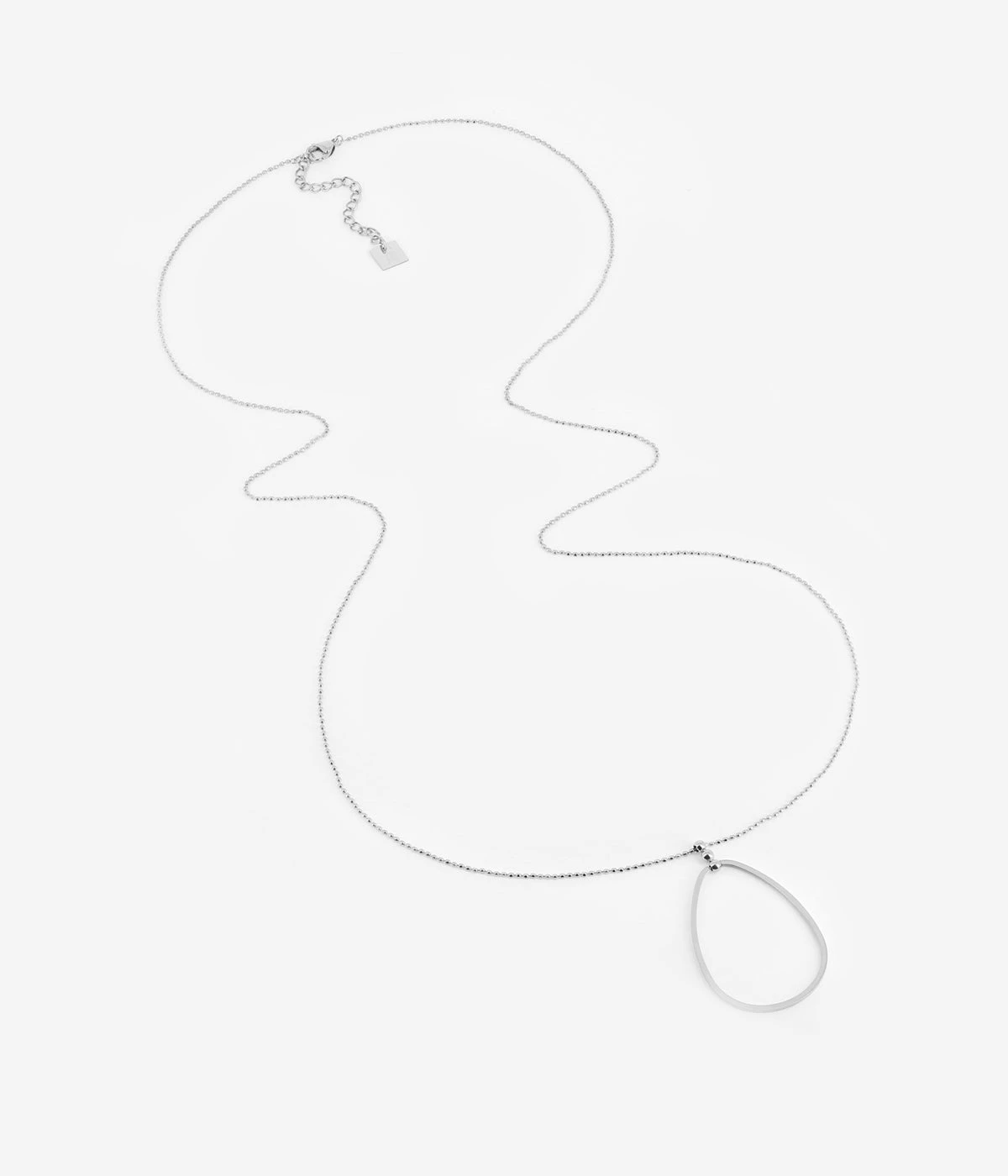 Collier long en acier uni ou dorĂ© Ă l’or fin sur lequel est suspendu un pendentif de forme gĂ©omĂ©trique en forme de poire.
